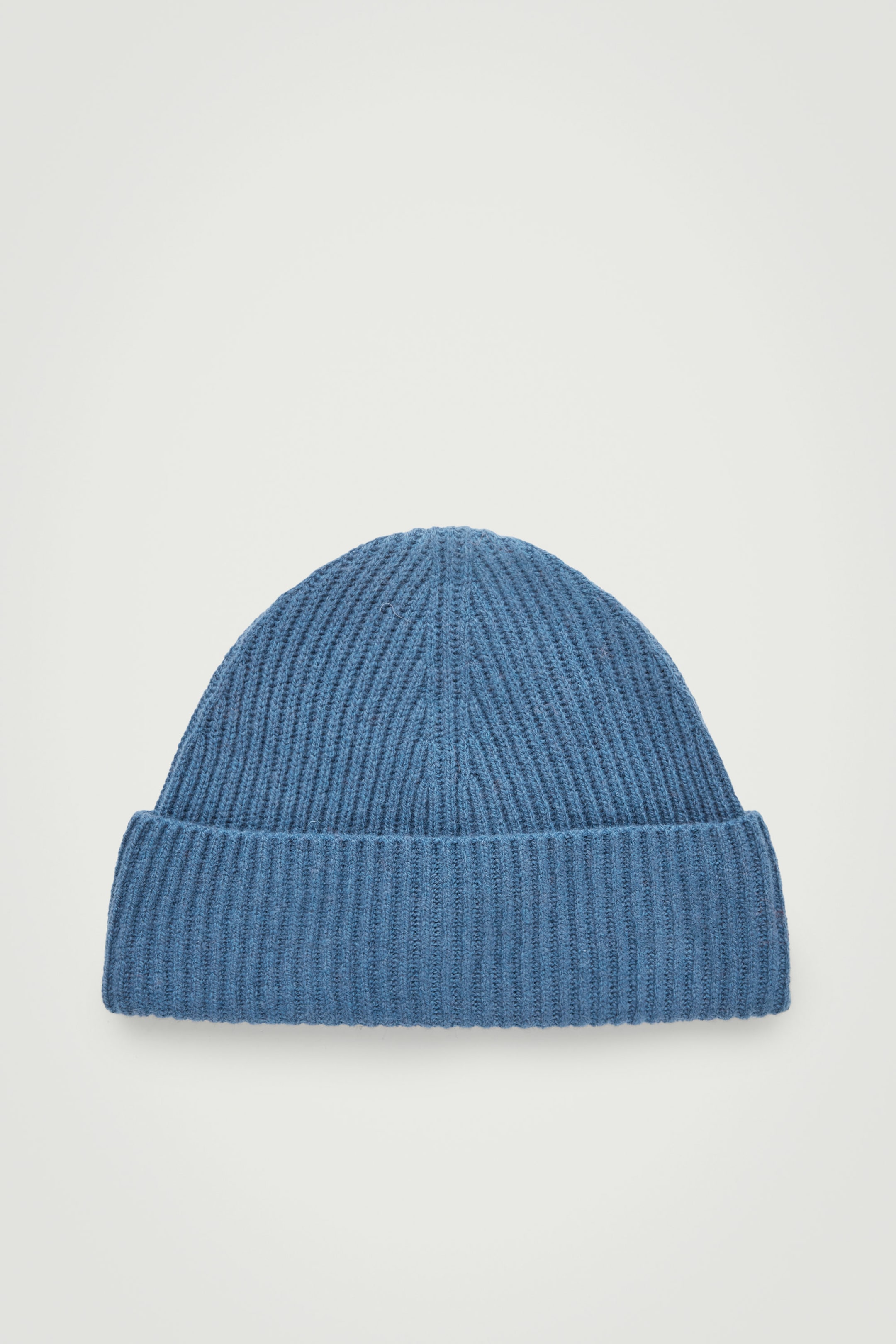Diese stahlblaue Mütze besteht aus reiner RWS-Wolle und hält dank des breiten Umschlags und der Rippstrickkonstruktion angenehm warm.