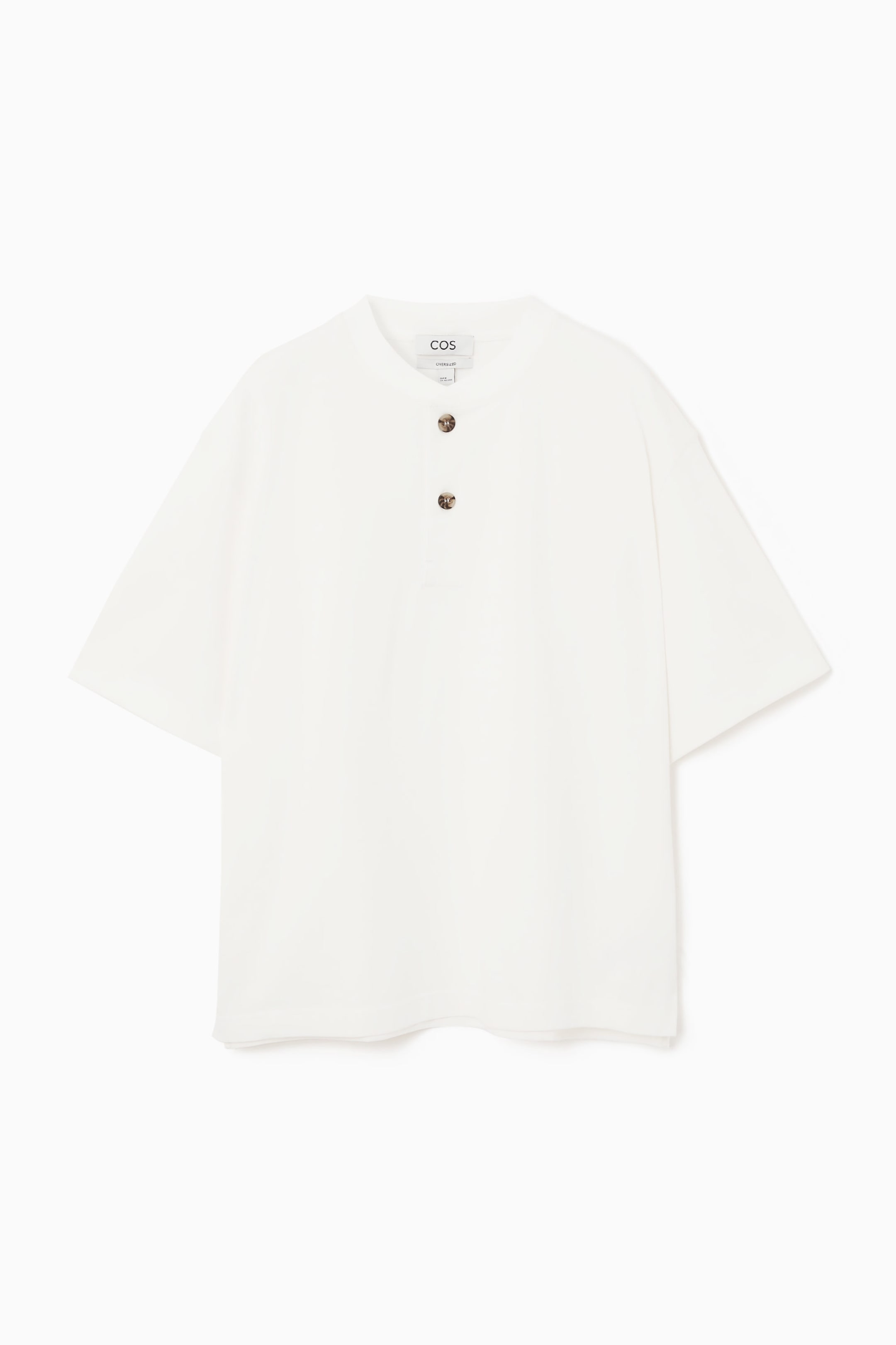 COS kennt sich bestens mit der Kreation moderner Basics aus. Dieses weiße T-Shirt hat ein schlichtes, kragenloses Design mit einer kurzen Knopfleiste. Es besteht aus einer gewichtigen Biobaumwoll-Viskose-Mischung und erhält durch die Oversized-Passform eine legere Optik.