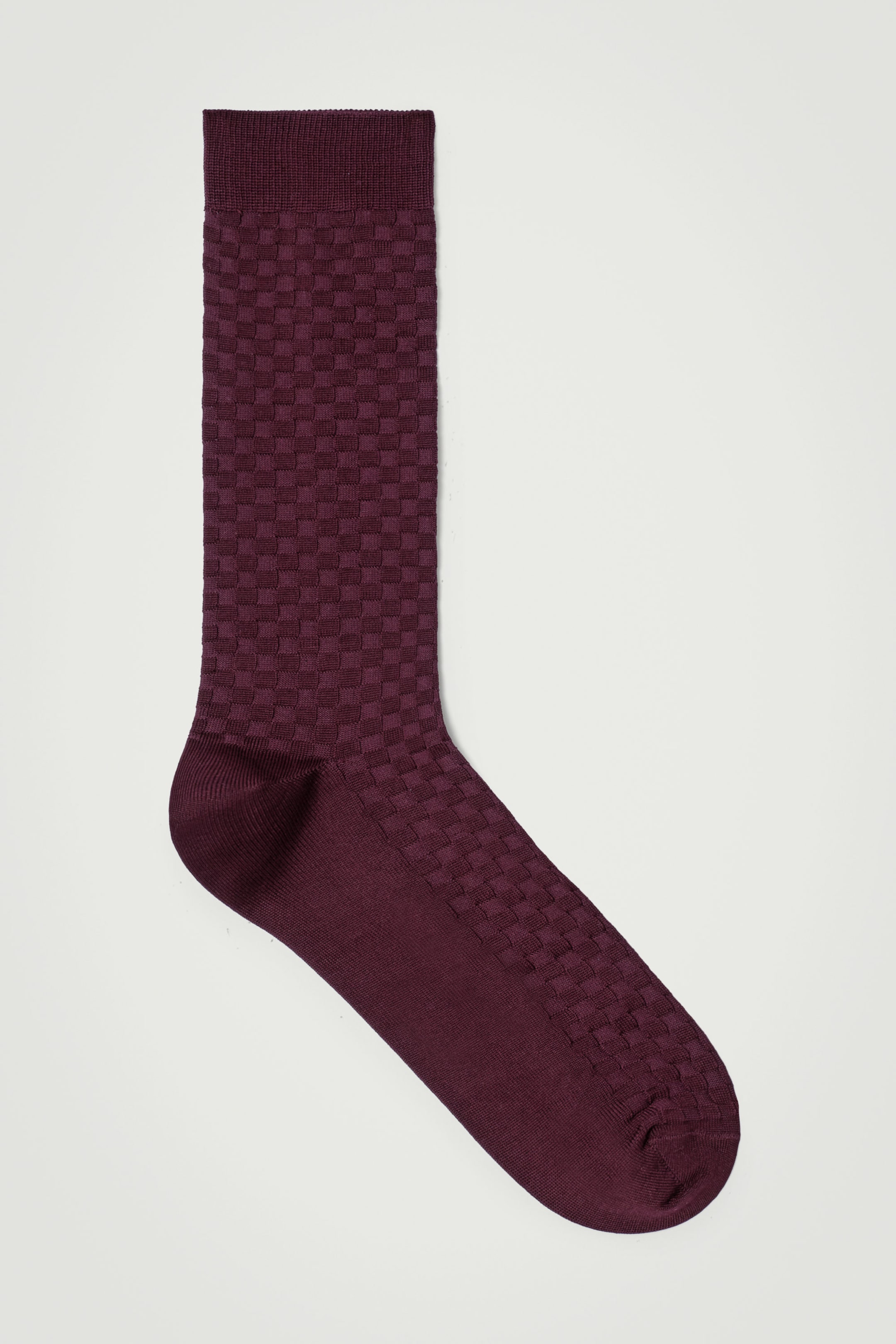 Diese Socken verleihen eleganten Sets einen raffinierten letzten Schliff. Das Paar aus einer weichen Baumwollmischung präsentiert sich mit einem aufwendigen Karo-Jacquardmuster und hat fein gerippte Abschlüsse, die nicht verrutschen.