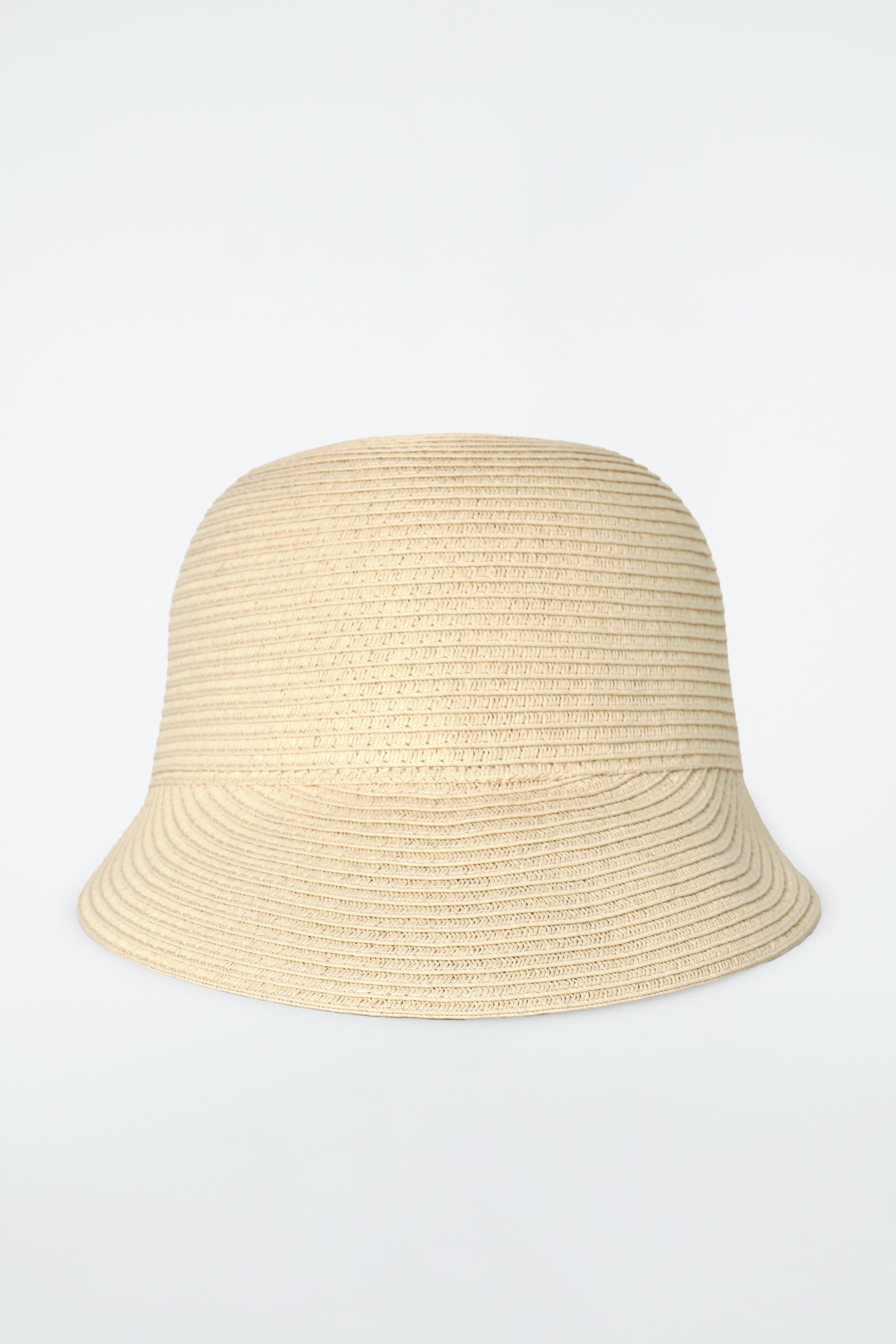 Dieses moderne Accessoire ist eine Mischung aus Basecap und Sonnenblende. Es besteht aus Papierstroh gewebt, hat eine schräge Form und eine breite, abgerundete Krempe zum Schutz der Augen.