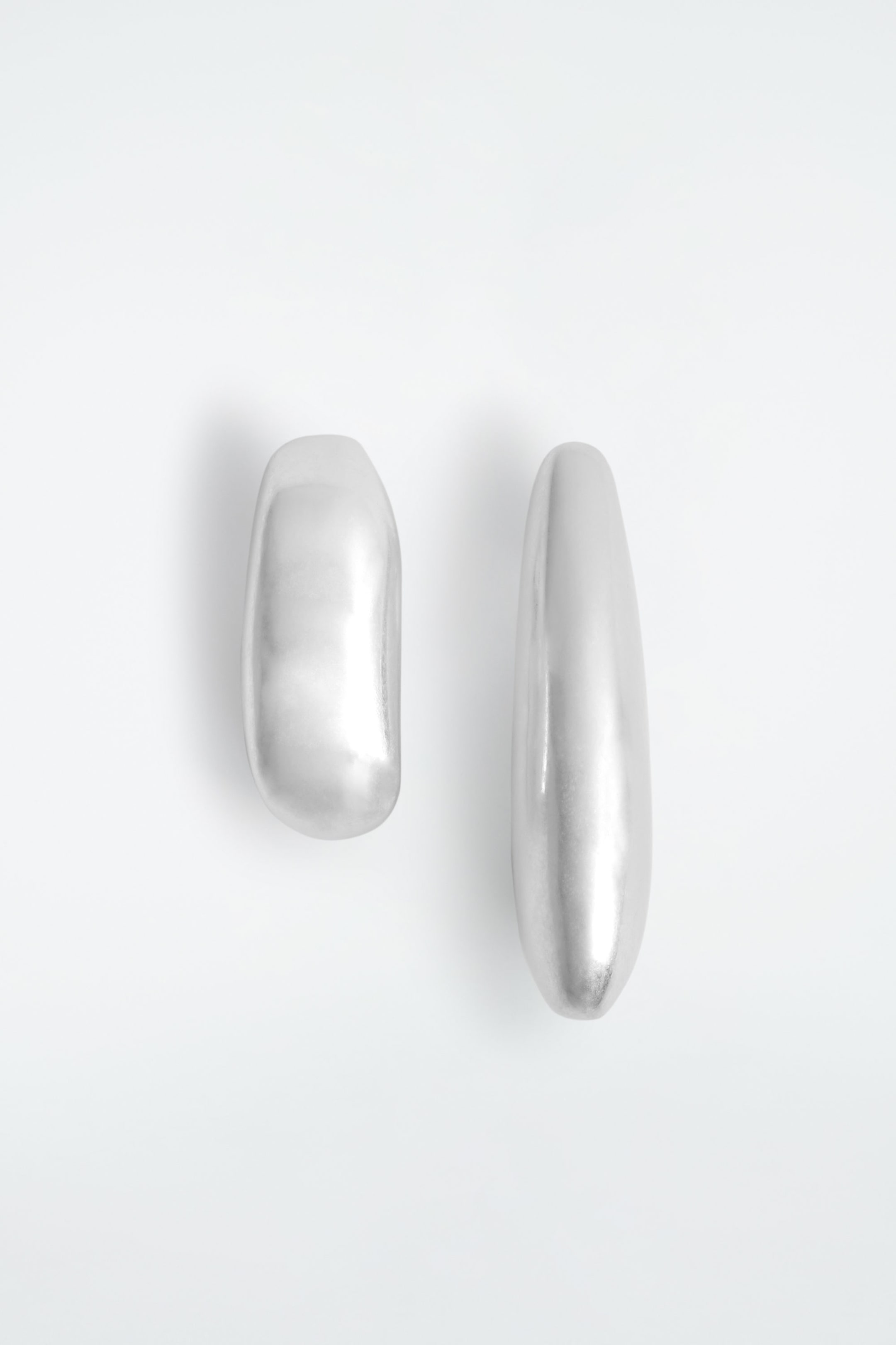 Diese architektonisch anmutenden Ohrringe haben eine Oberflächenstruktur, die durch eine kunsthandwerkliche Prägetechnik entsteht. Die Accessoires aus versilbertem recyceltem Messing sind unterschiedlich gestaltet.