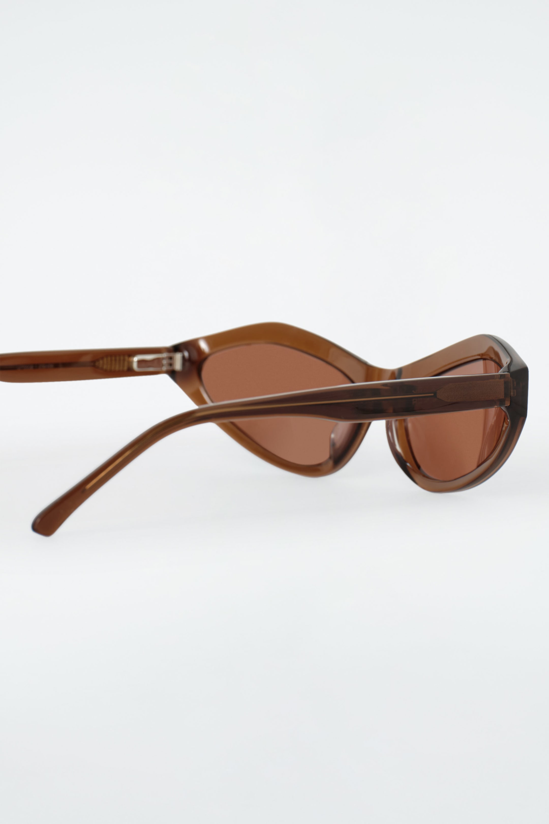 In dieser Saison präsentiert das Accessoire-Team eine neue Interpretation einer Racer-Sonnenbrille im Retro-Stil. Das Accessoire mit getönten Gläsern und eckiger Cat-Eye-Silhouette ist in einem sepiabraunen Farbton gehalten und umrahmt Ihr Gesicht dank der leicht gewölbten Form vorteilhaft.