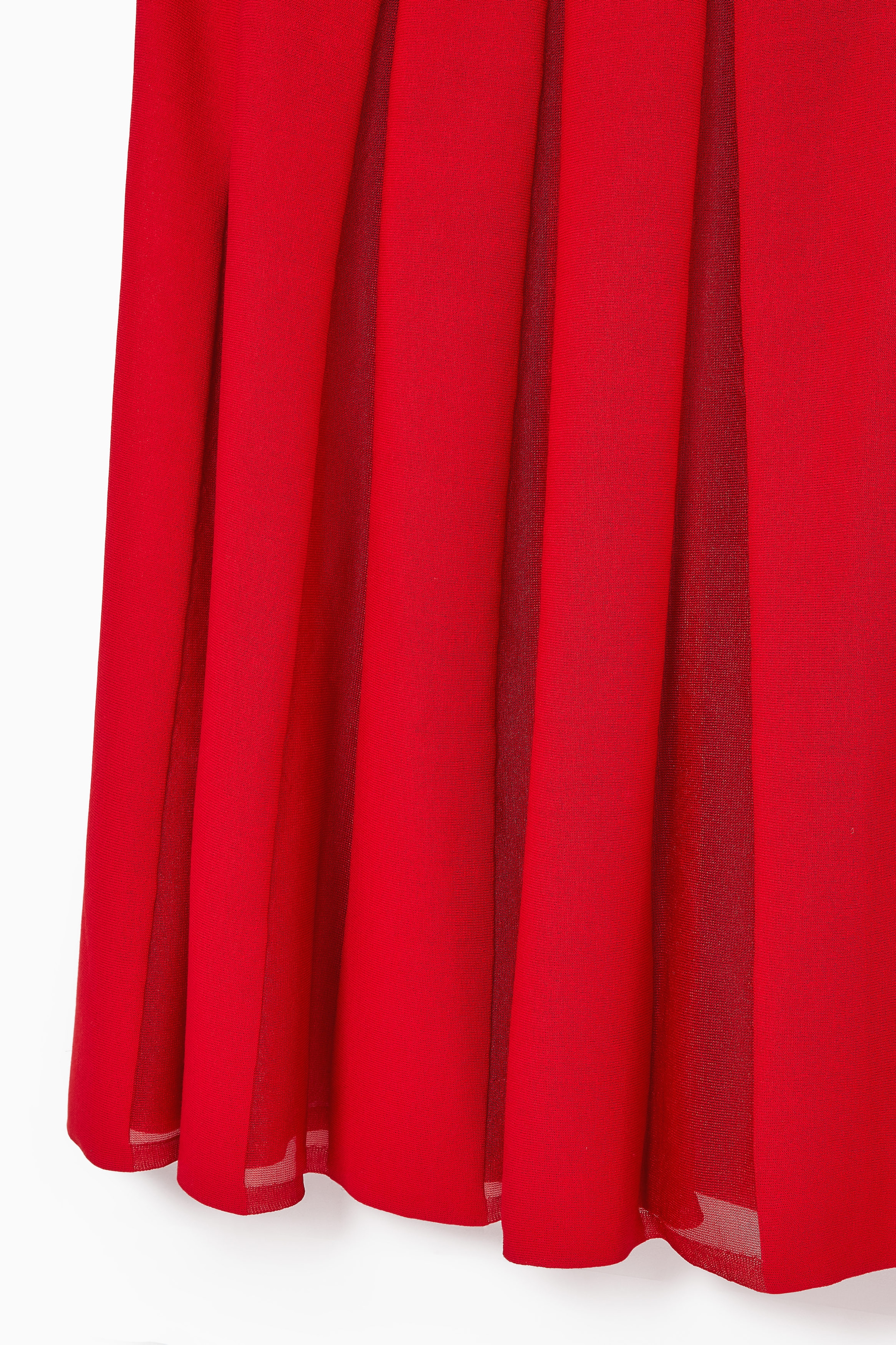 Wir haben das klassische Maxikleid mit griffigen Materialien und aufwendigen Designdetails neu interpretiert. Dieses Strickmodell aus einer Baumwollmischung ist in einem kräftigen Rotton gehalten, der auch in dieser Saison eine wichtige Rolle spielt. Es präsentiert sich mit breiten gerippten Einsätzen, die in Kellerfalten übergehen und für mehr Bewegung am Saum sorgen. Der Rock ist mit leicht kontrastierenden, transparenten Partien versehen, die etwas Haut hervorblitzen lassen.