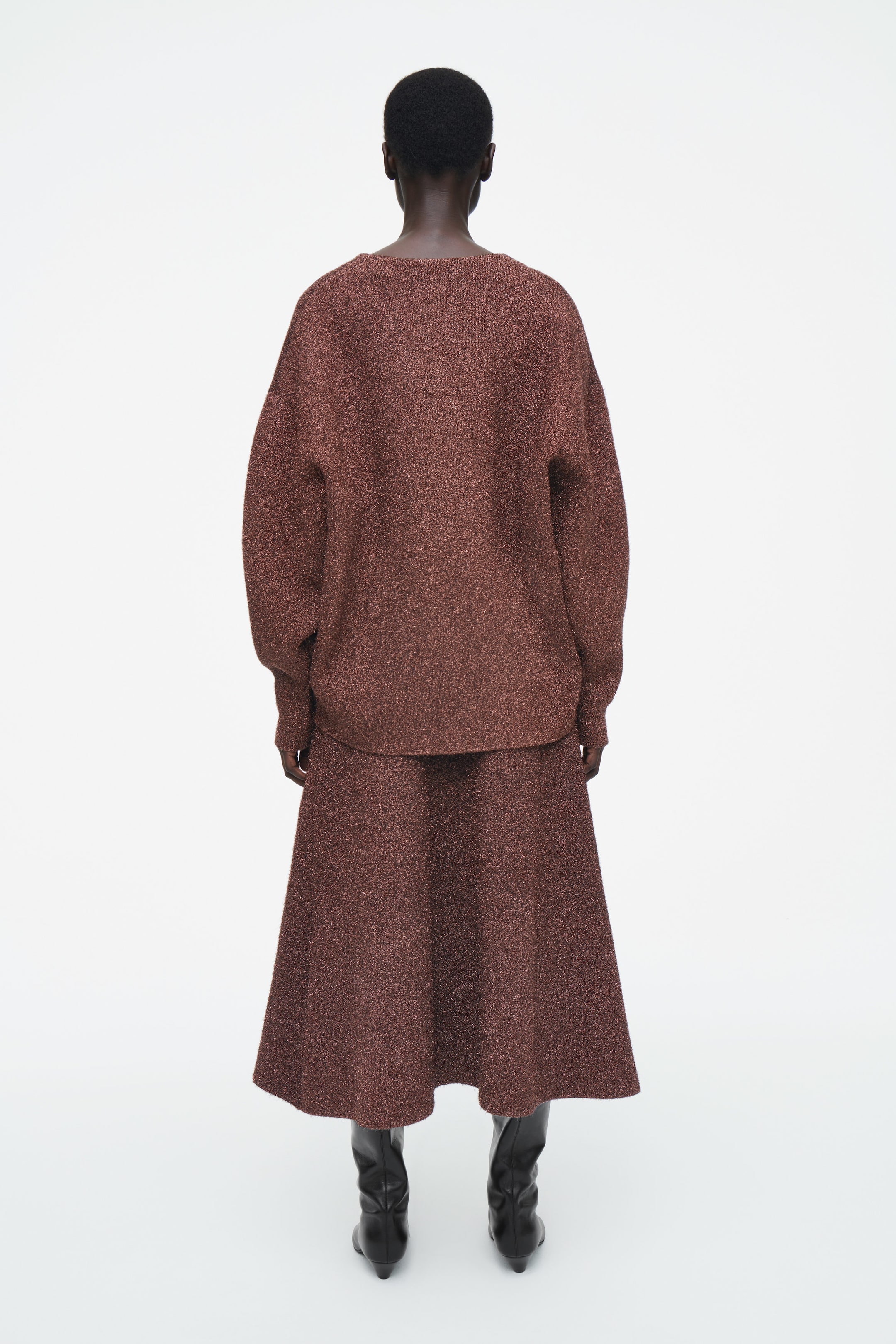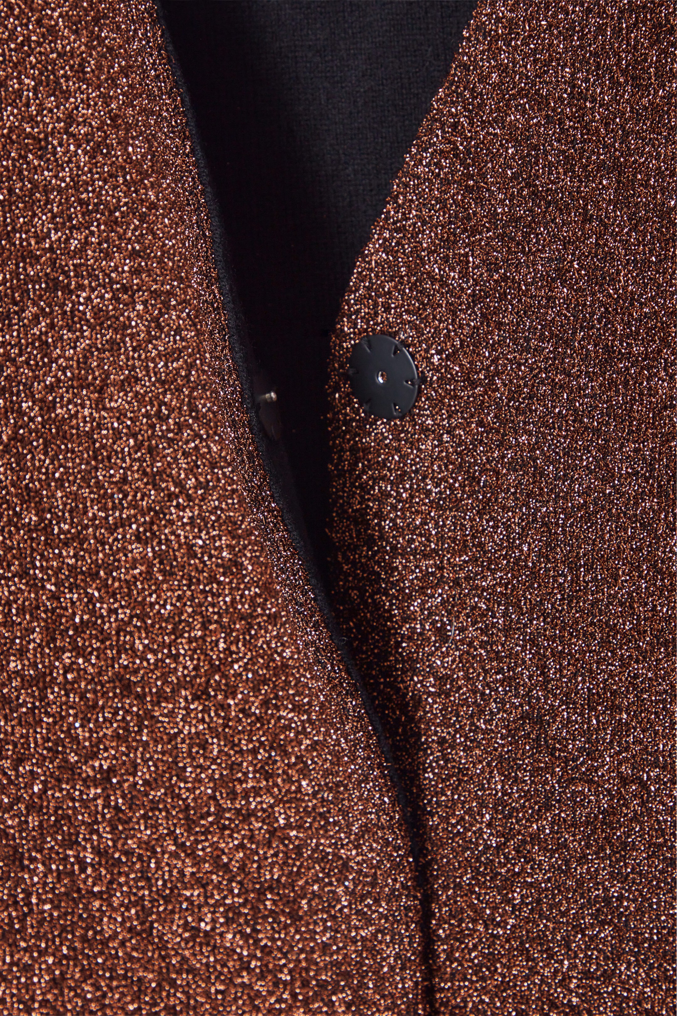 Dieser Cardigan mit V-Ausschnitt besteht aus hochwertiger Merinowolle mit Metallic-Fasern, die das Licht wunderschön reflektieren, und ist ein idealer Vorbote für die Partysaison. Er hat eine lockere Passform und die Innenseite des Doubleface-Materials hat eine sanfte schokoladenbraune Farbe. Ziehen Sie durch die Kombination mit dem passenden Rock alle Blicke auf sich.