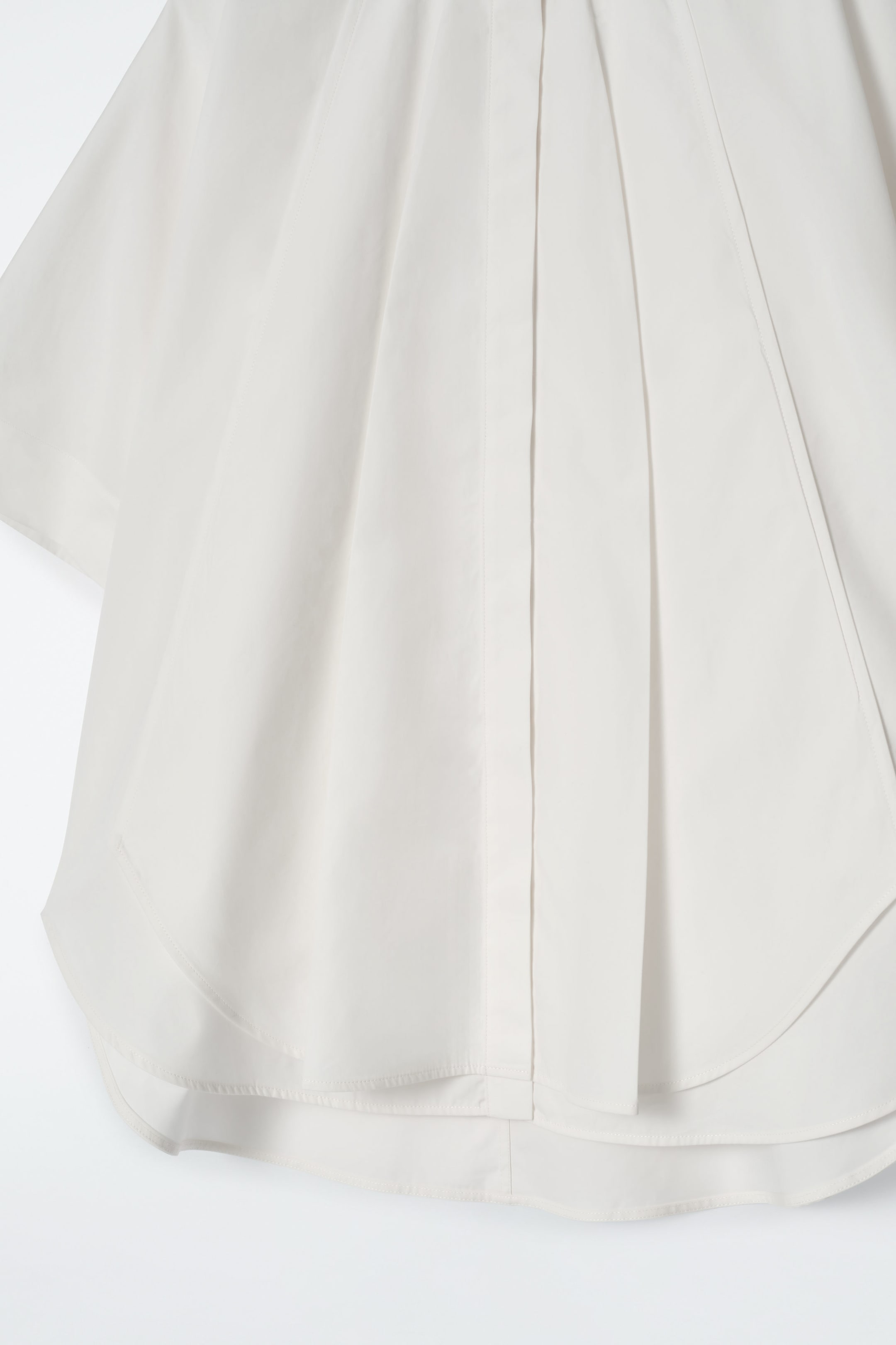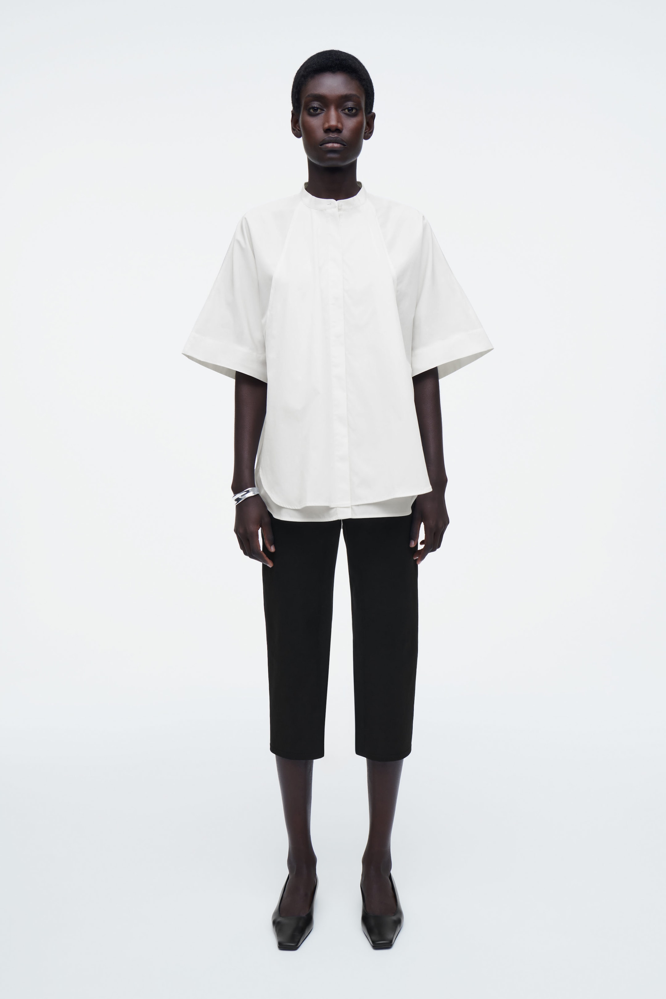 Dieses strahlend weiße Oberteil stellt eine Neuinterpretation des klassischen Hemdes dar. Das Oversized-Modell hat kurze Ärmel, einen abgerundeten Saum und ein Latzdetail an der Vorderseite, das es wirken lässt, als wäre es mehrlagig. Kombinieren Sie es mit langen Shorts und Pantoletten.