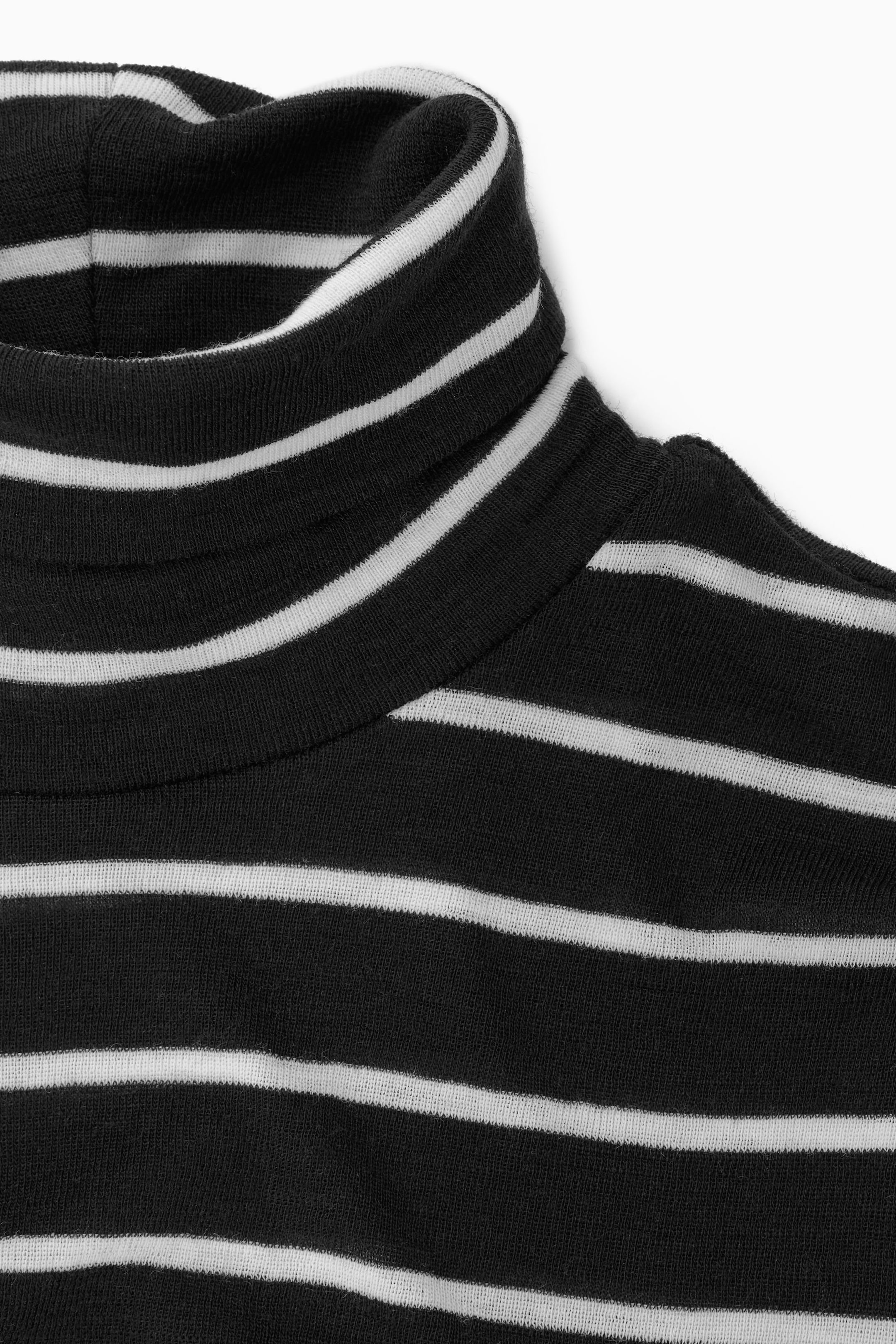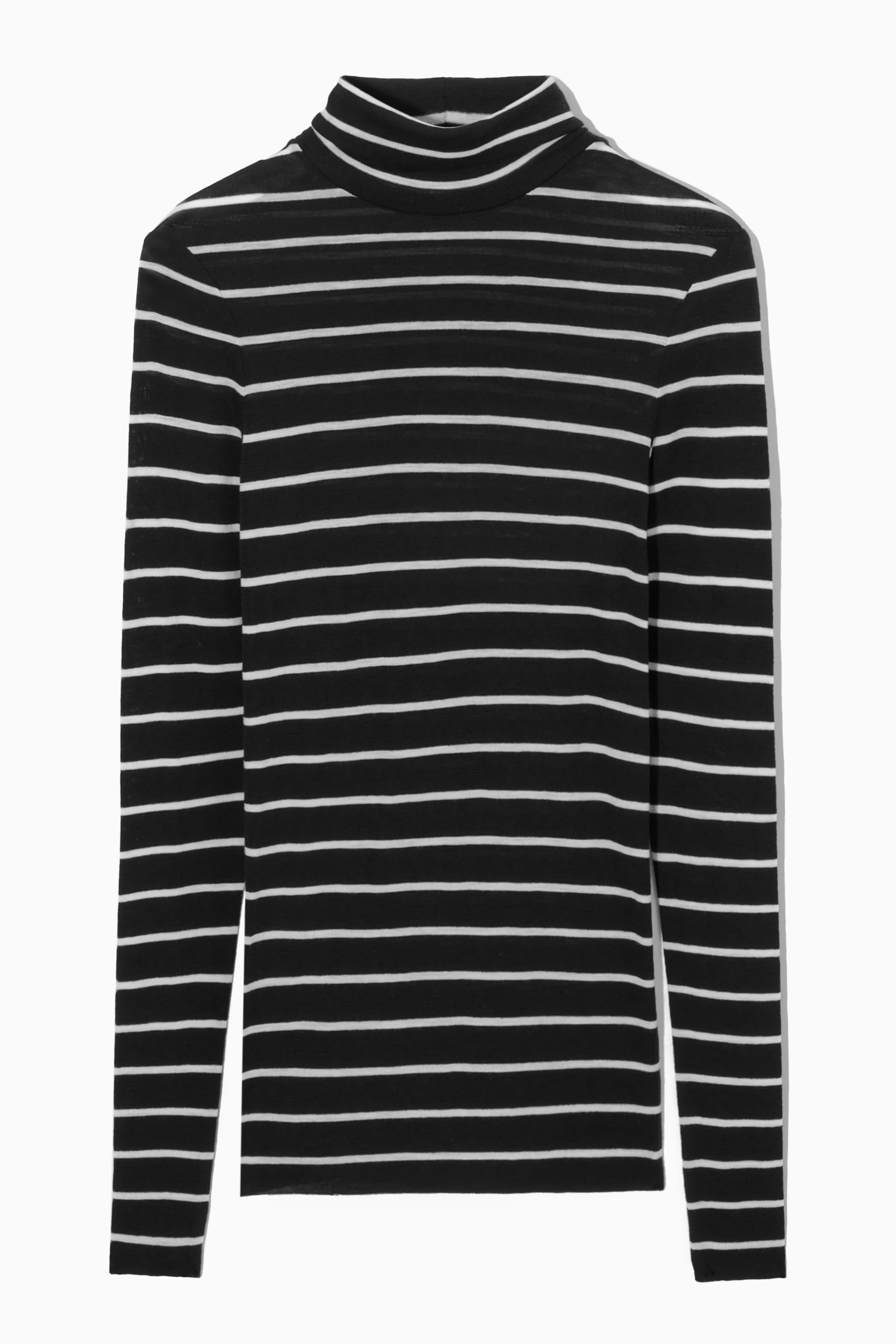 Dieses klassische Oberteil besteht aus reiner Merinowolle und hat einen hohen Rollkragen sowie Streifen in Schwarz und Weiß. Es ist schmal geschnitten und eignet sich daher hervorragend für Lagen-Looks in der Übergangszeit.