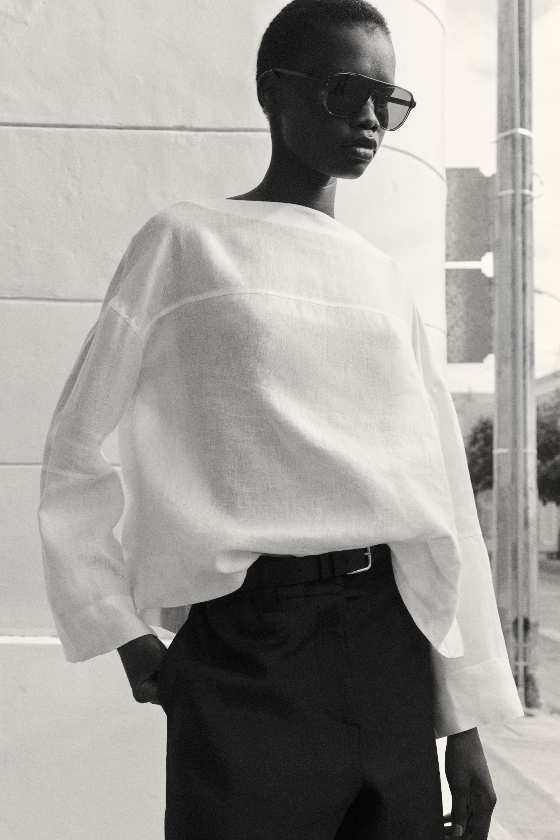 woman white linen long sleeve top with aviator sunglasses and black bottoms