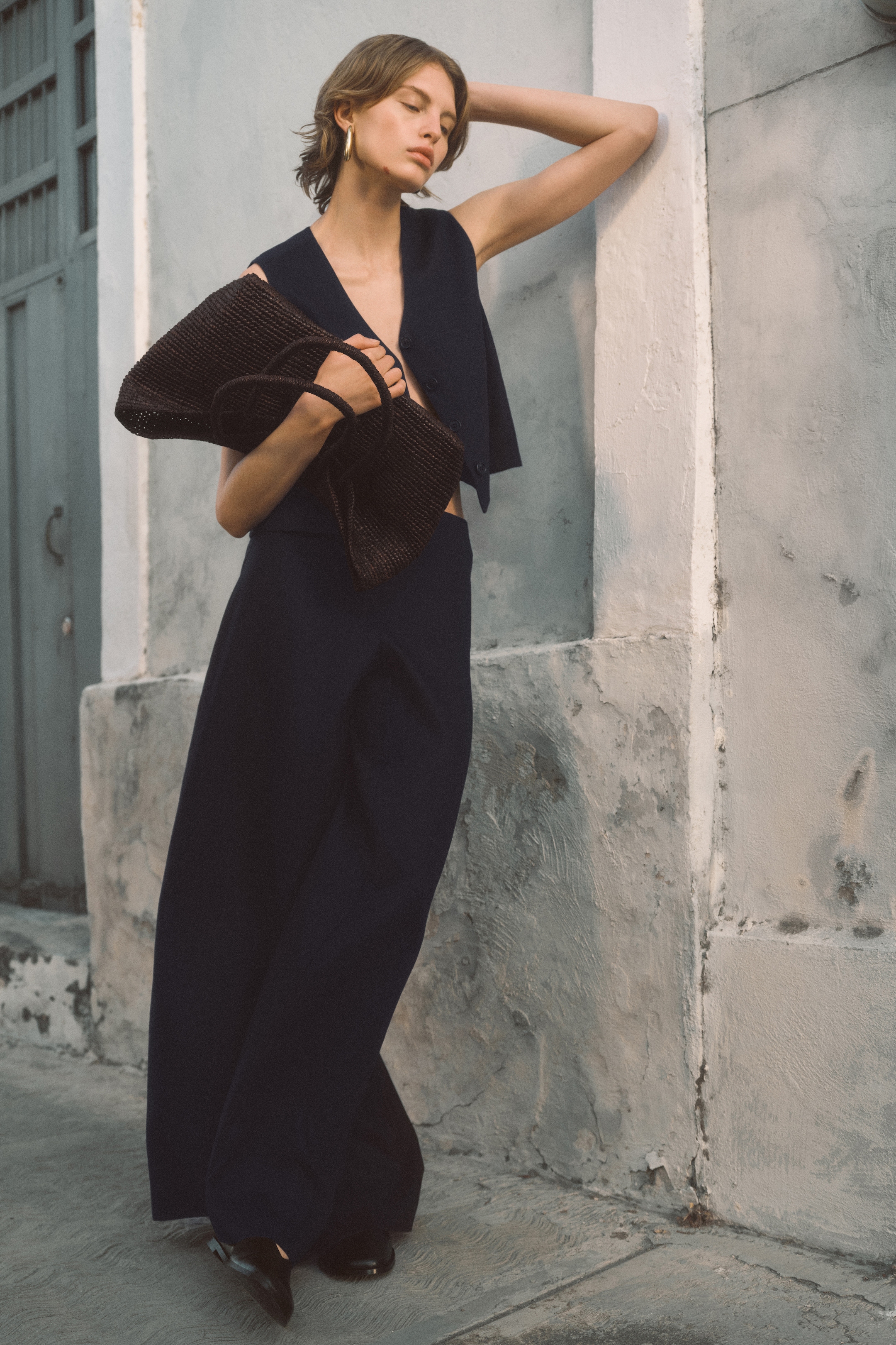 woamn in navy vest with matching wide pants