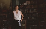 woman in white wrap top and black bottom with belt on