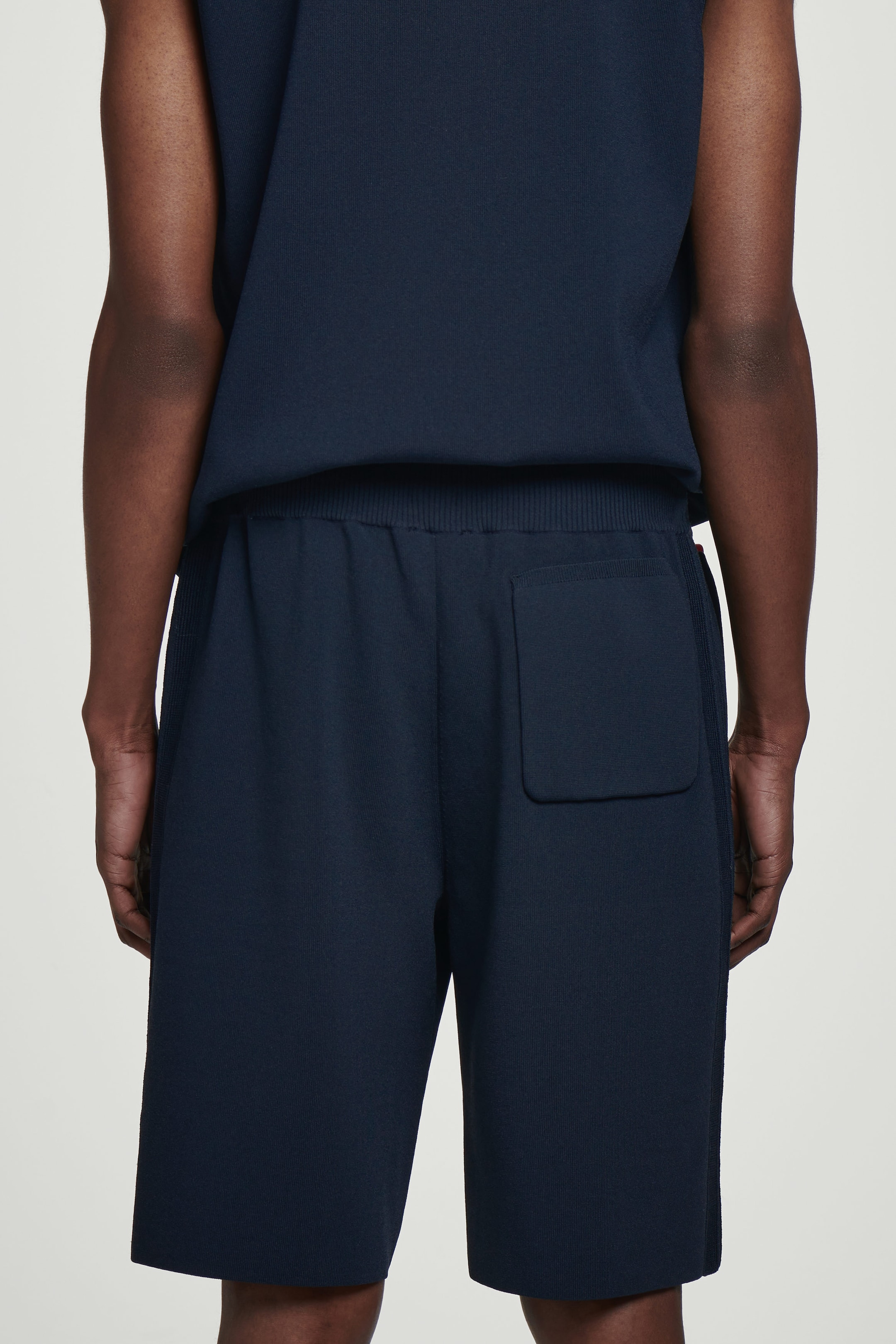 Das Team für Herrenmode setzt für die Frühjahrs-/Sommerkollektion 2025 auf von Sportbekleidung inspirierte Silhouetten. Diese raffinierten Strickshorts haben farblich abgestimmte Seitendetails, die an Athleisure erinnern, und einen elastischen Bund.