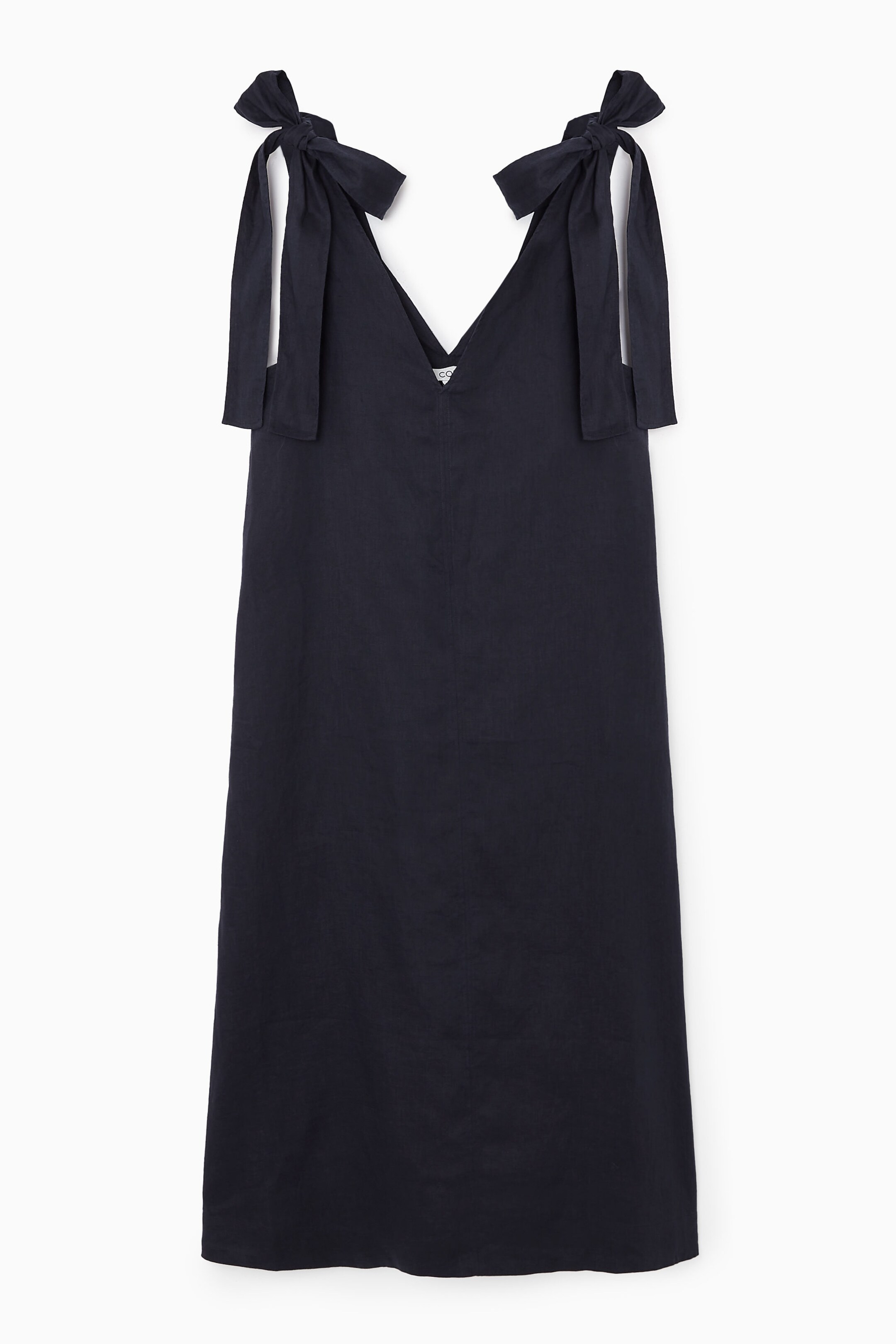 Leinen eignet sich hervorragend für entspannte Sonnentage. Dieses Midikleid in dunklem Navyblau hat eine A-Linien-Silhouette und einen V-Ausschnitt an der Vorder- und Rückseite. Beide Schulterträger lassen sich zu Schleifen binden.