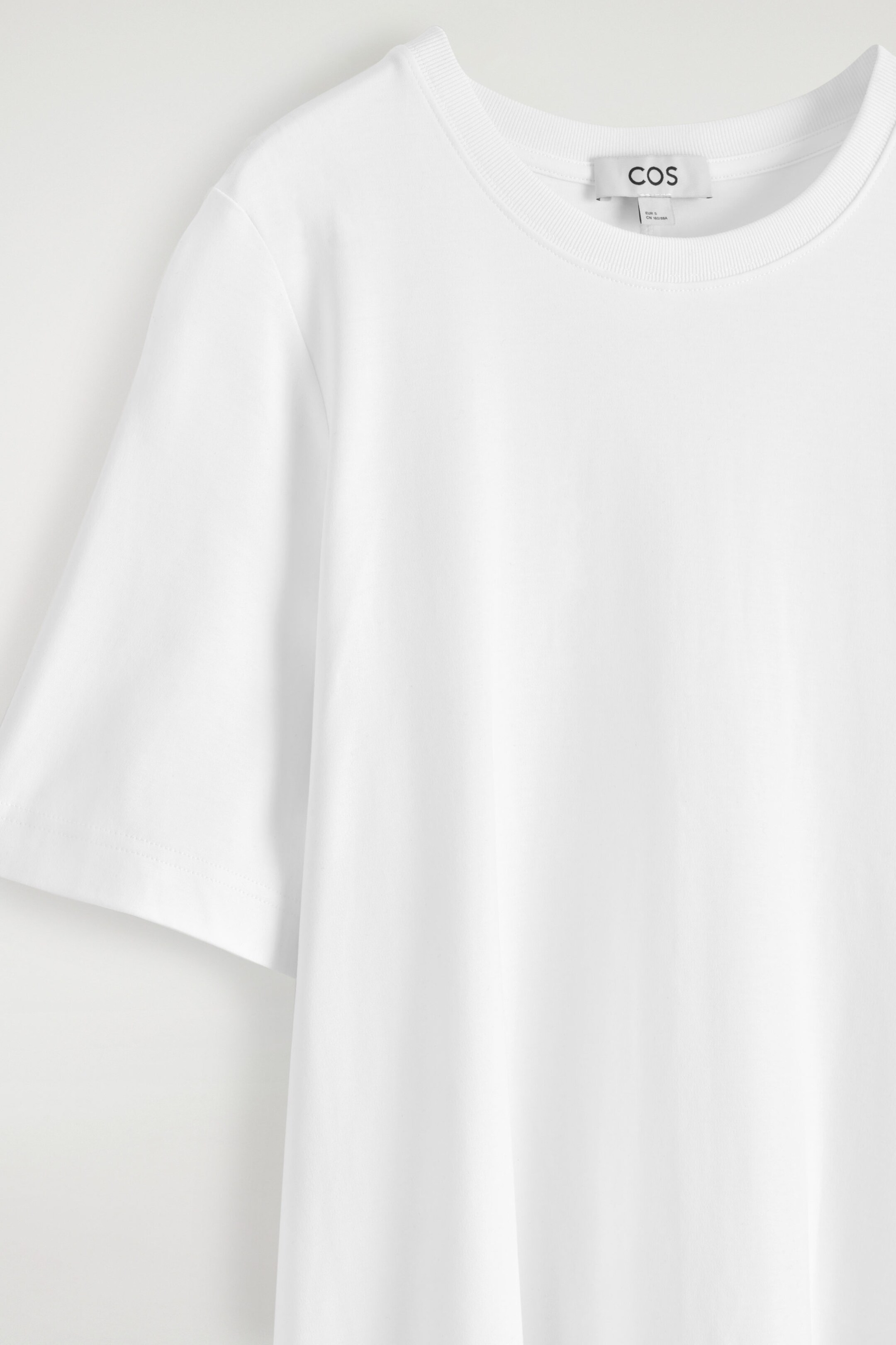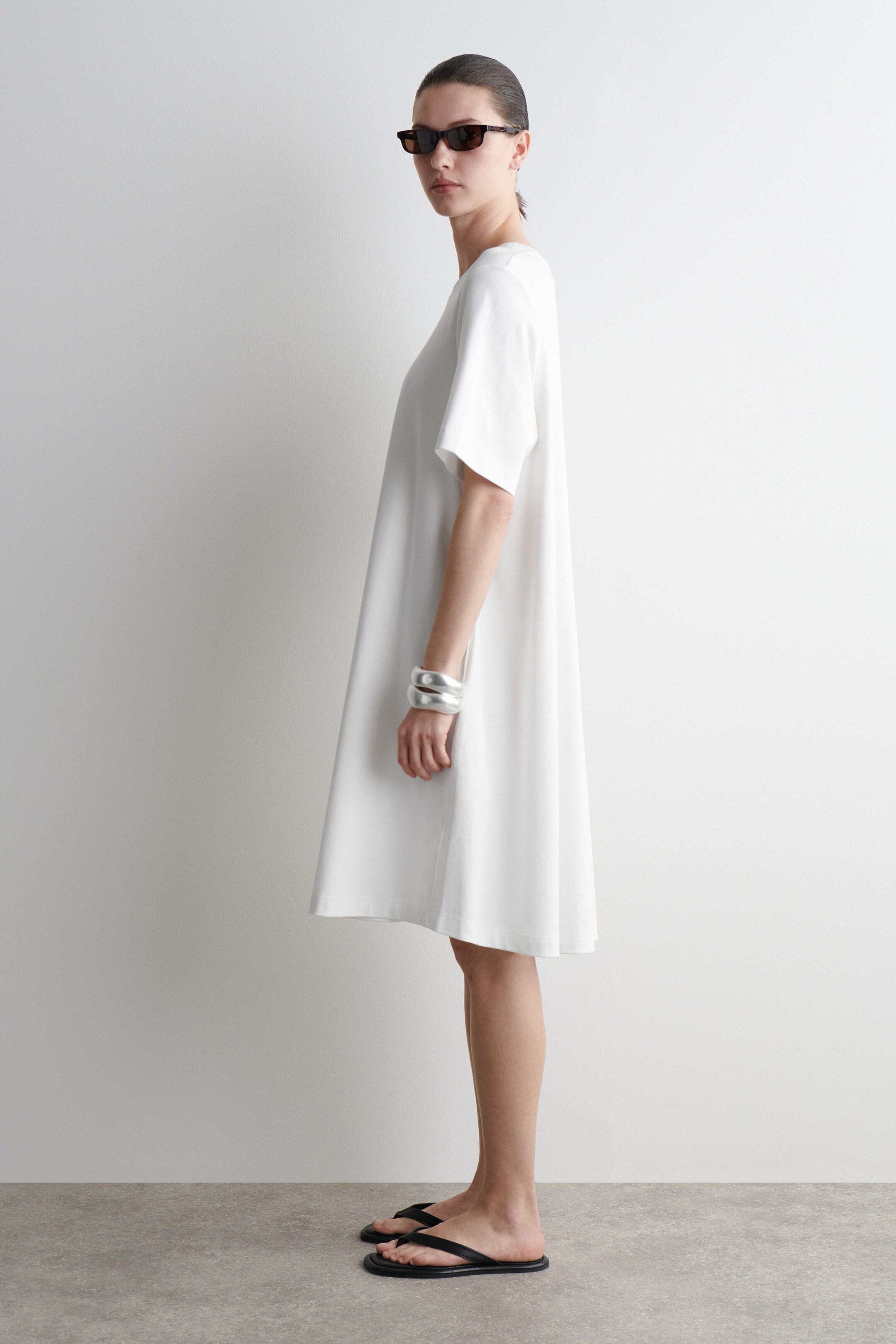 Dieses moderne T-Shirt-Kleid ist perfekt für laue Tage. Es besteht aus natürlich atmungsaktiver Baumwolle und hat eine lockere Silhouette. Die A-Linie verleiht dem Kleid ein luftiges Tragegefühl, zudem hat es unauffällige Eingrifftaschen an beiden Seiten.