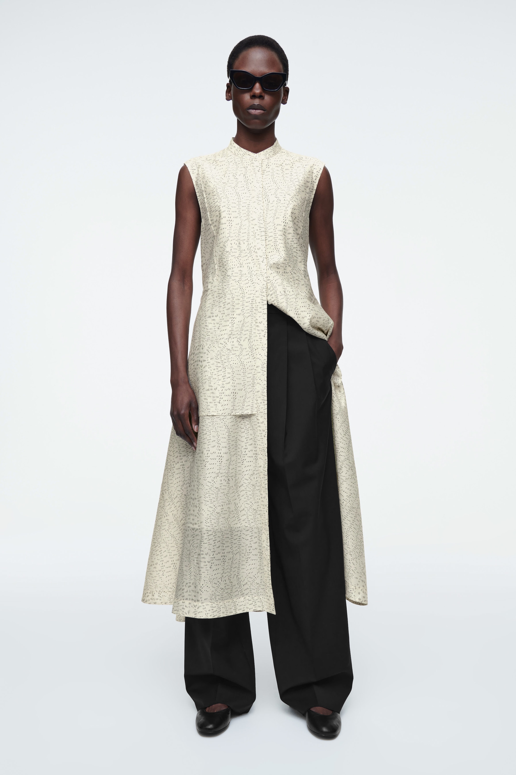 Dynamische Muster bringen eine frische Perspektive in die Garderobe der neuen Saison. Dieses moderne Hemdkleid ist aus einer fließenden TENCEL™ Lyocell-Mischung gefertigt und mit einem Großvaterkragen, einem ausgestellten Midirock und drapierten Bändern geformt, die die Taille definieren. Der dynamische Druck wurde aus einem Vintage-Jacquard-Textil entnommen und auf seine einfachste Form reduziert, um einen handgezeichneten Effekt zu erzielen.