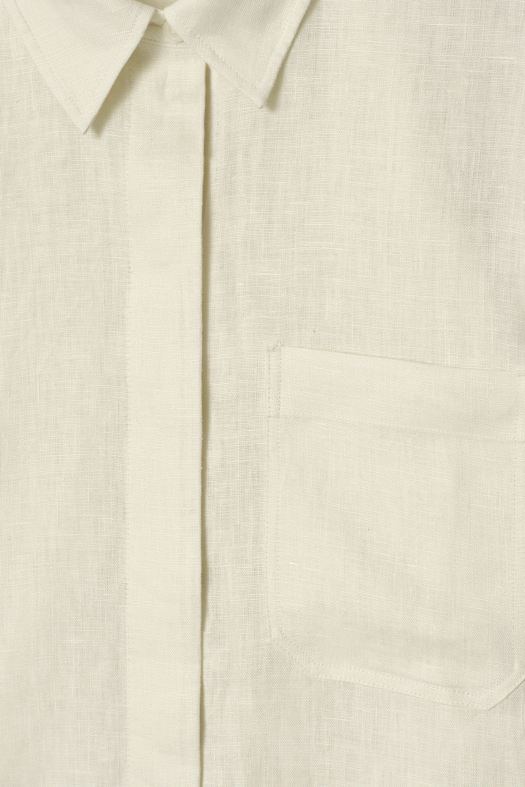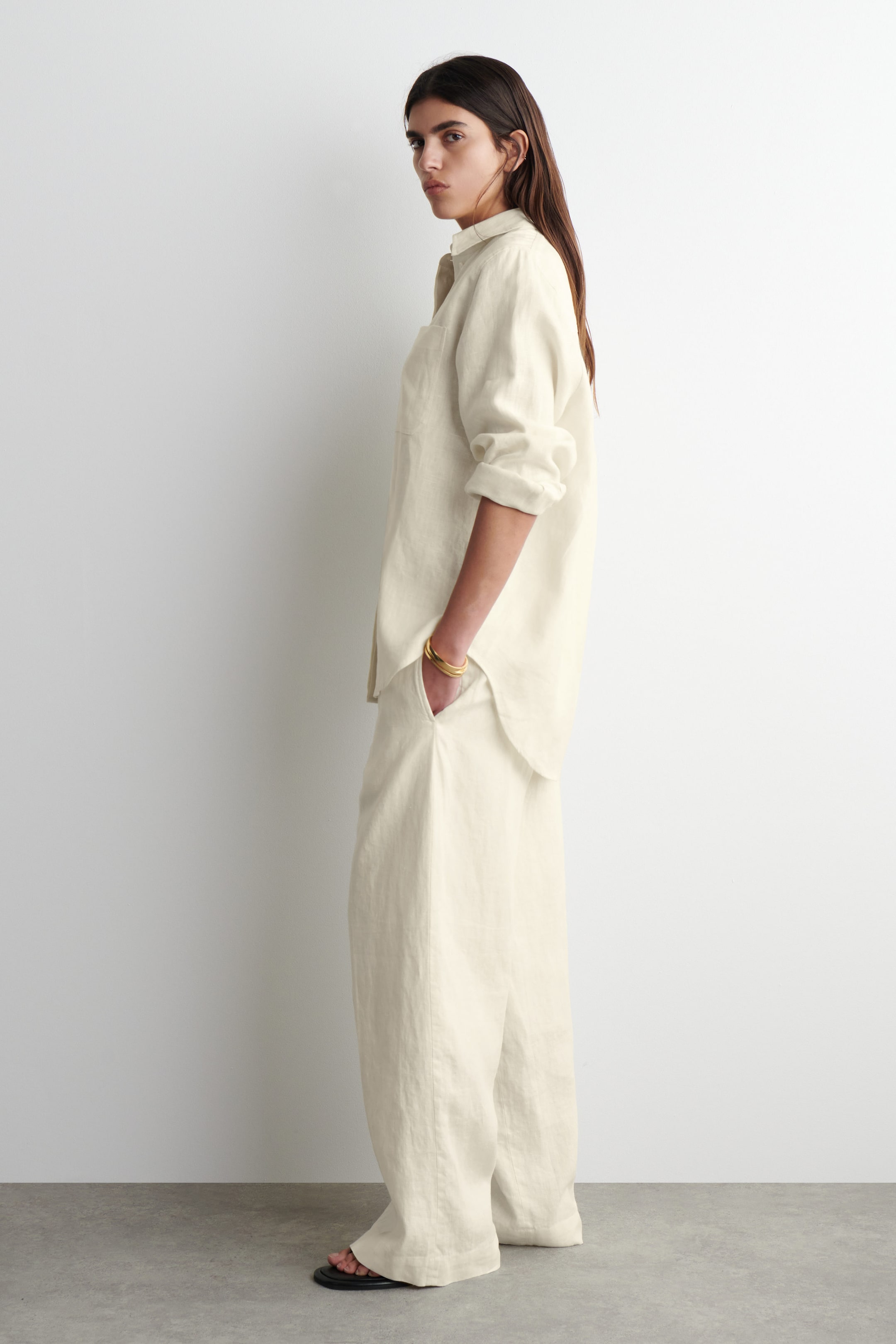 Dieses klassische Hemd in Hellgelb wurde aus leichtem, griffigem Leinen gefertigt, das von Natur aus atmungsaktiv ist. Das Oversized-Modell hat einen spitzen Kragen, eine aufgesetzte Tasche sowie einen Stufensaum. Tragen Sie die passende Hose dazu; an wärmeren Tagen können Sie diese auch mit der kurzärmligen Variante des Hemds kombinieren.