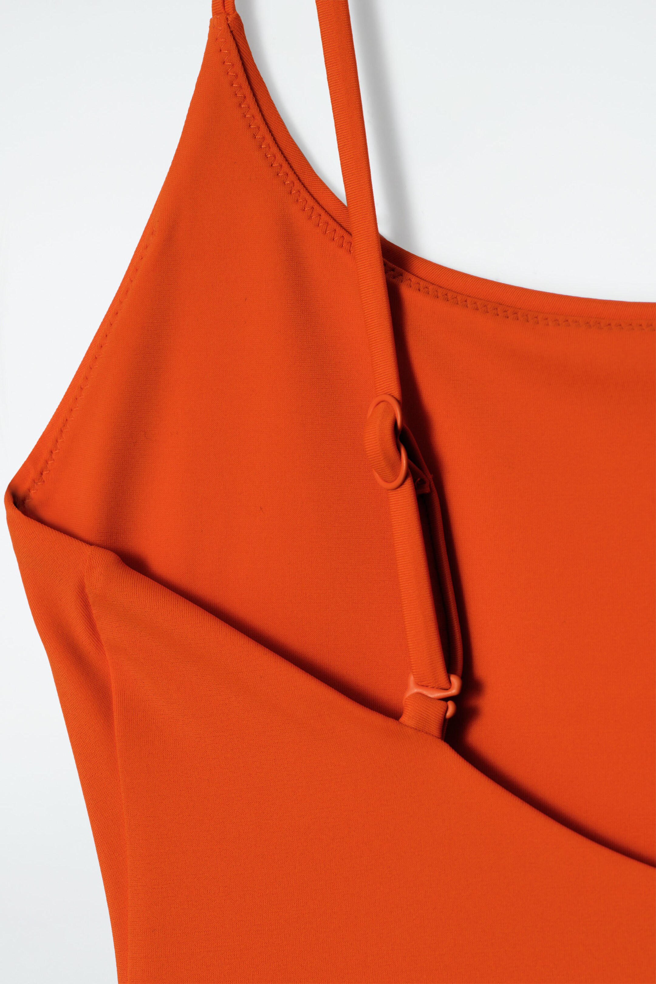 Dieser elegante Badeanzug eignet sich perfekt für Tage am Wasser. Das orangefarbene Modell hat einen tiefen Ausschnitt, einen tiefen Rückenausschnitt sowie verstellbare Träger.
