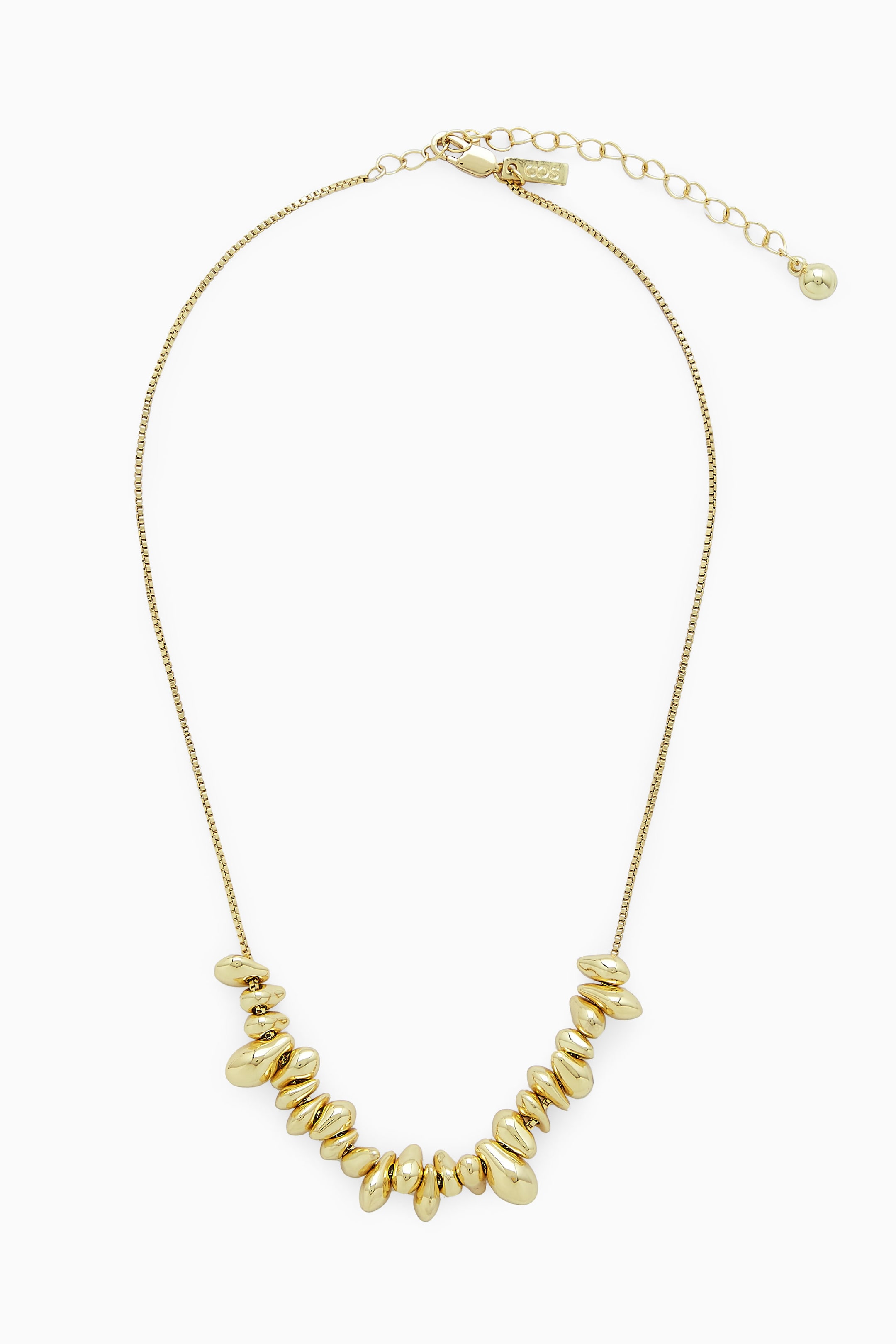 In dieser Saison haben sich die Schmuckdesigner von COS von organischen Formen und Strukturen inspirieren lassen. Diese wunderschön gearbeitete, dünne Halskette aus vergoldetem recyceltem Messing ist mit unregelmäßigen tropfenförmigen Perlen verziert. Ein besonders edler Look entsteht in Kombination mit den passenden Ohrringen.