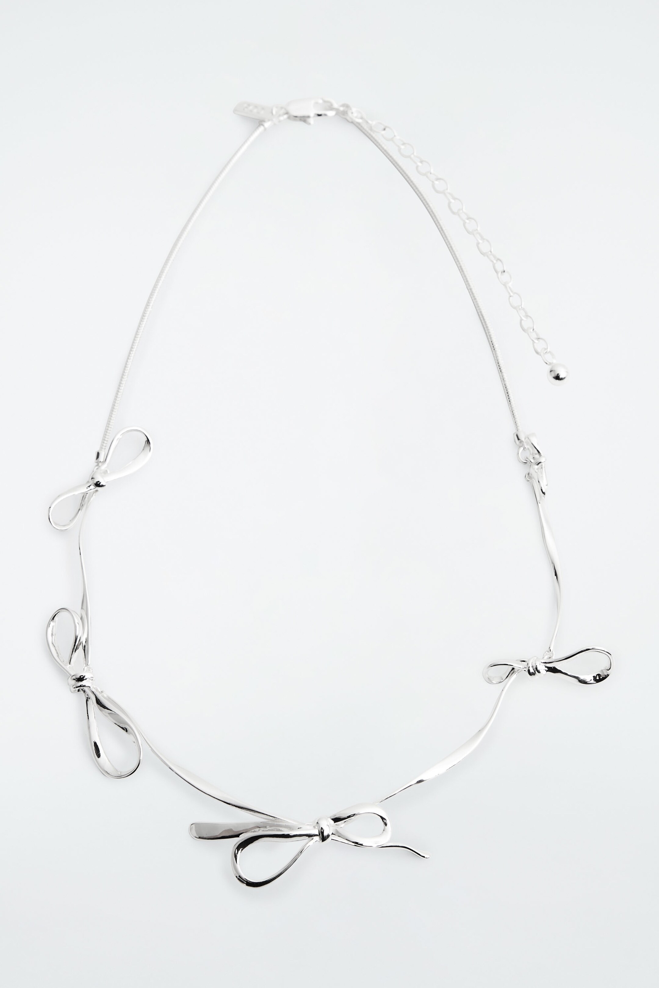 Diese Schlangen-Halskette interpretiert den Schleifentrend der Saison auf spielerisch-elegante Art. Sie wurde aus versilbertem recyceltem Messing gefertigt und firmenintern von Hand gegossen, wodurch einzigartige Schleifenformen entstanden. Ziehen Sie durch die Kombination mit den passenden Haarspangen alle Blicke auf sich.
