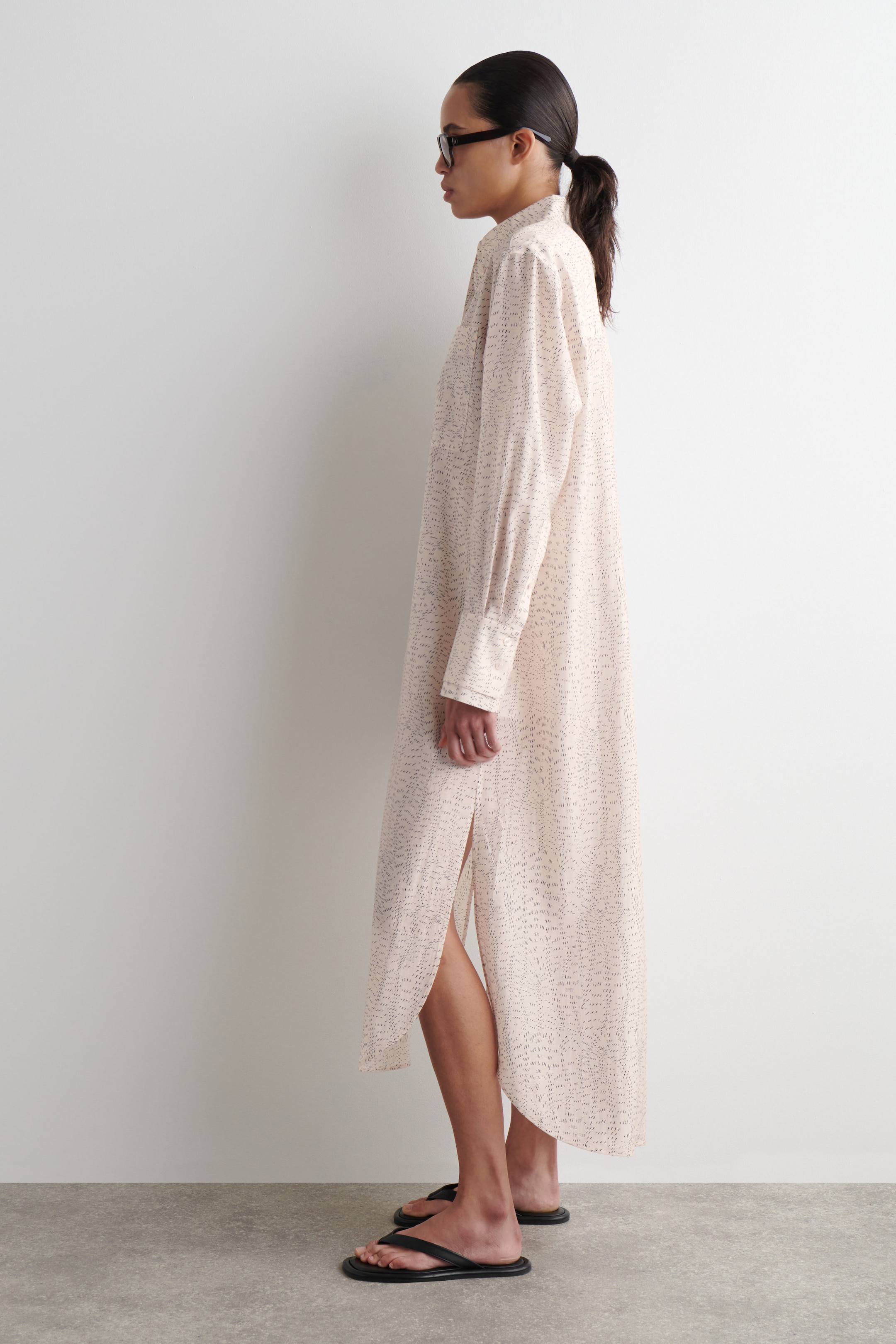 Dynamische Muster bringen eine neue Perspektive in die Garderobe der neuen Saison. Dieses moderne Hemdblusenkleid aus einer fließenden TENCEL™ Lyocell-Mischung hat einen spitzen Kragen, eine Brusttasche und einen abgerundeten Saum. Der dynamische Print wurde von einem Vintage-Jacquard-Textil abgeleitet und auf seine einfachste Form reduziert, um einen handgezeichneten Effekt zu erzielen.