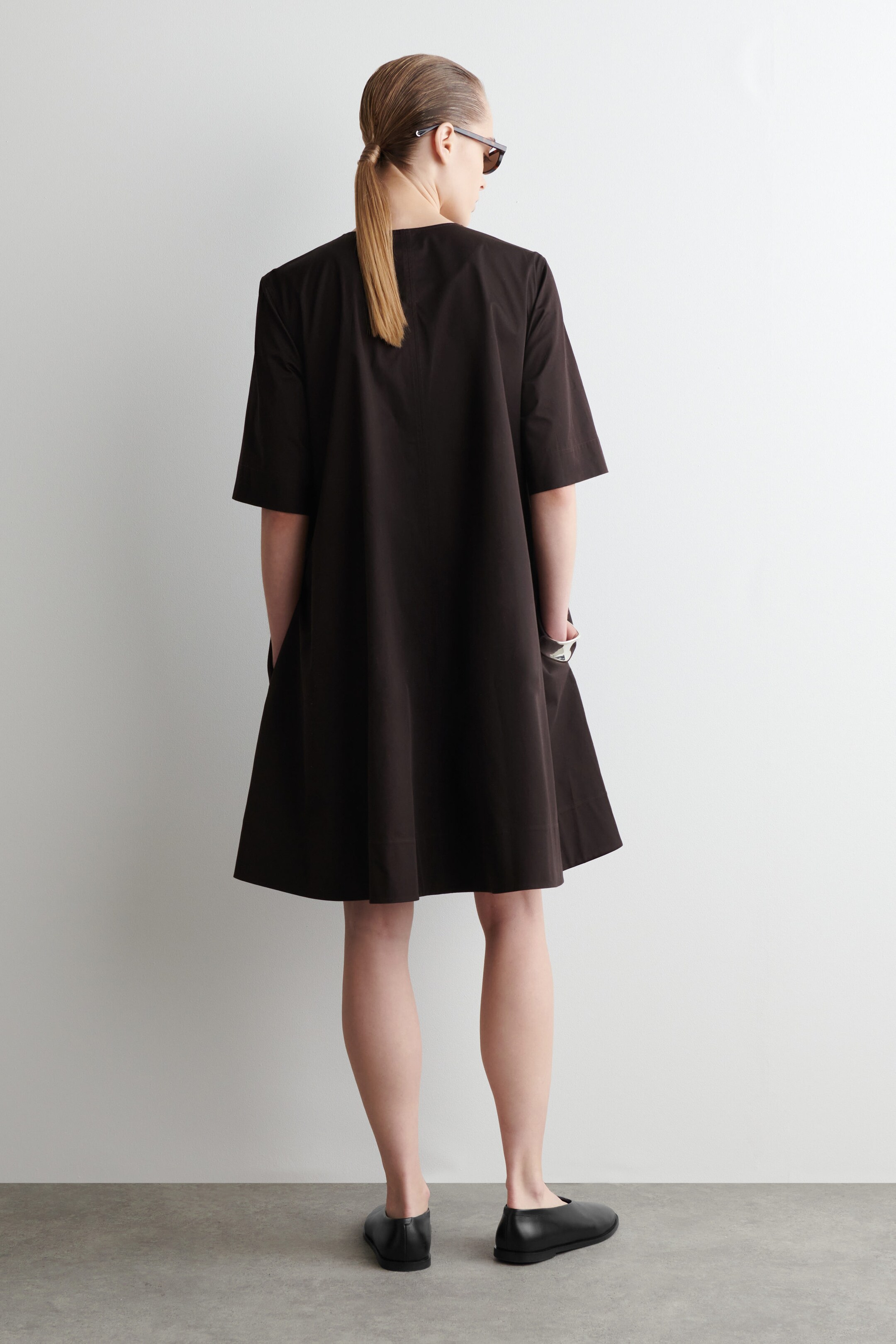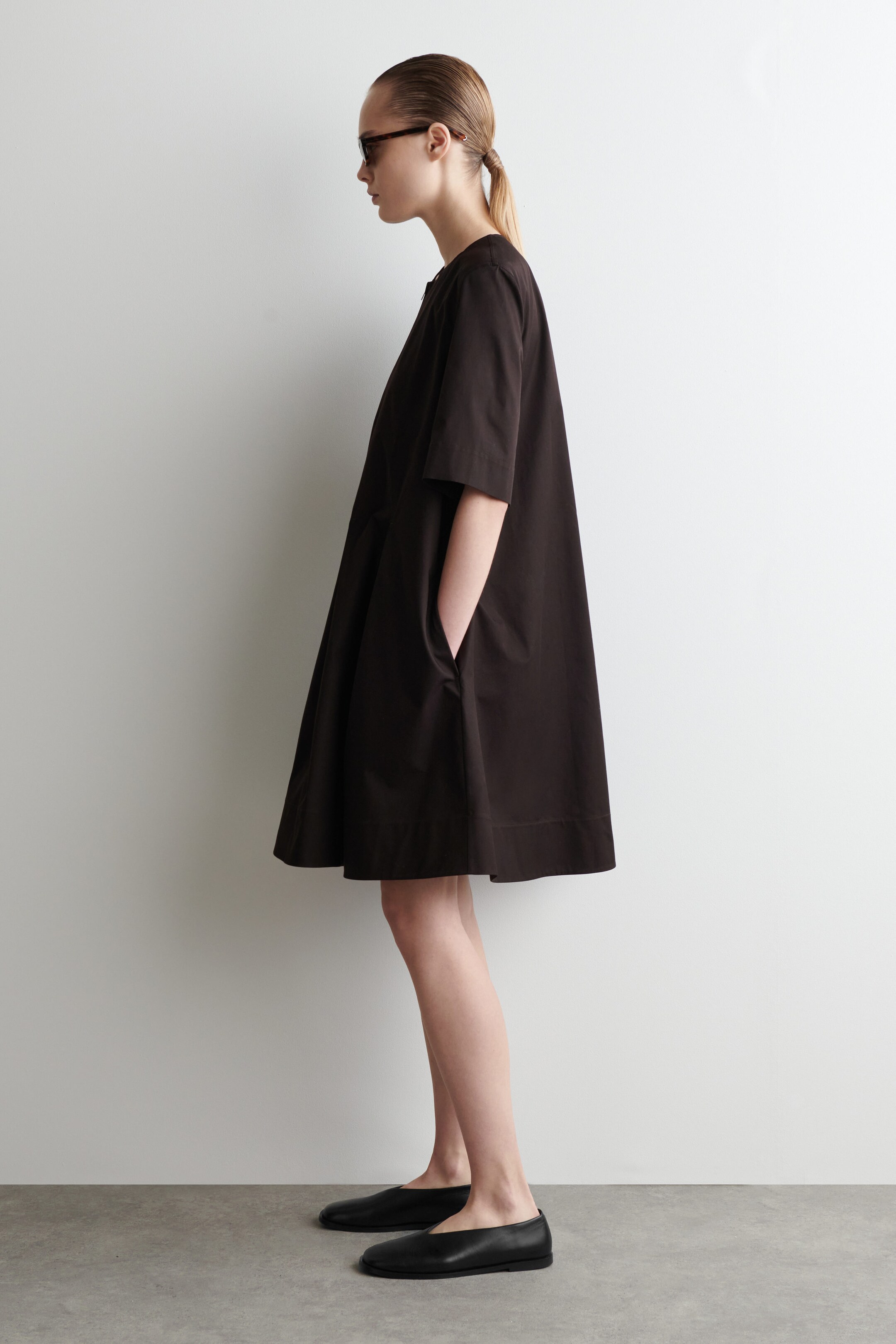Dieses Kleid ist eine raffinierte Interpretation des Utility-Stils und besticht durch genähte Einsätze, die in Kellerfalten übergehen. Es besteht aus weicher, dunkelbrauner Baumwolle, hat einen silberfarbenen Reißverschluss, kurze Ärmel und dezente Seitentaschen.
