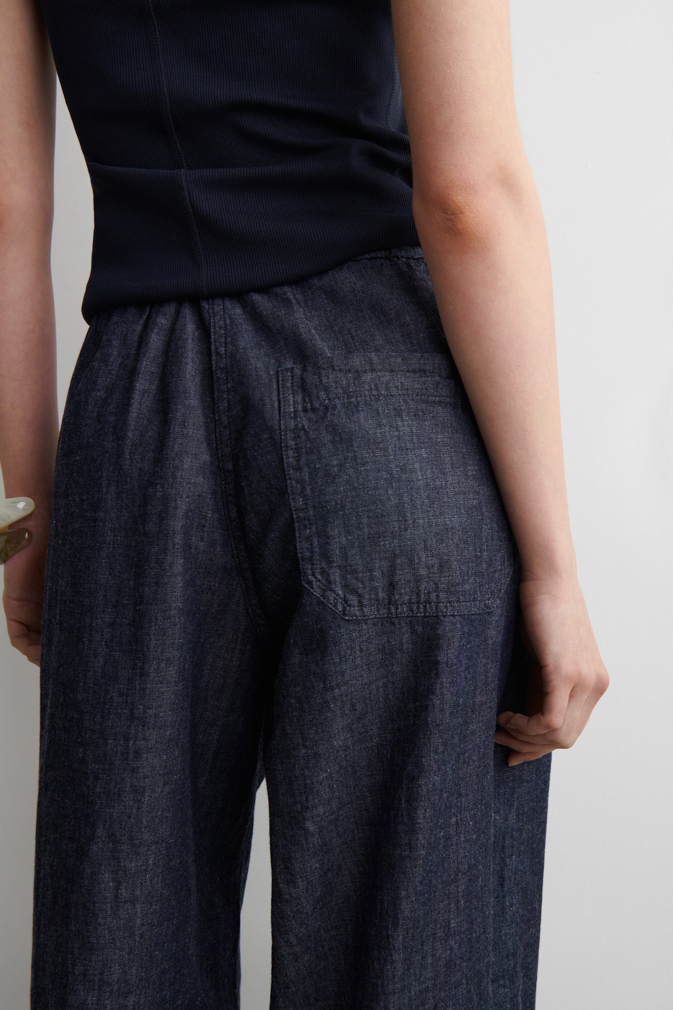 Das Damenmode-Team präsentiert für Frühjahr/Sommer 2025 eine neue Interpretation von Denim. Diese Hose besteht aus einer atmungsaktiven, strukturierten Mischung aus indigoblauer Biobaumwolle und Leinen. Sie hat zudem einen Kordelzugbund und praktische Taschen. Tragen Sie die passende Hemdjacke dazu.