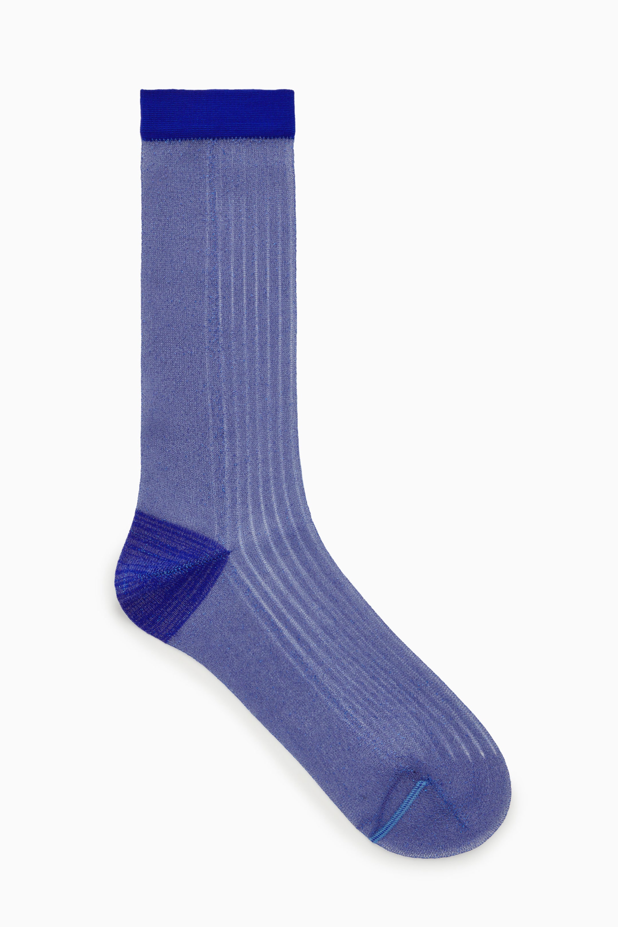 Made with metallised fibres in a sky-blue hue, these shiny ribbed socks have a subtle sheer finish with solid contrast heels and ribbed cuffs.