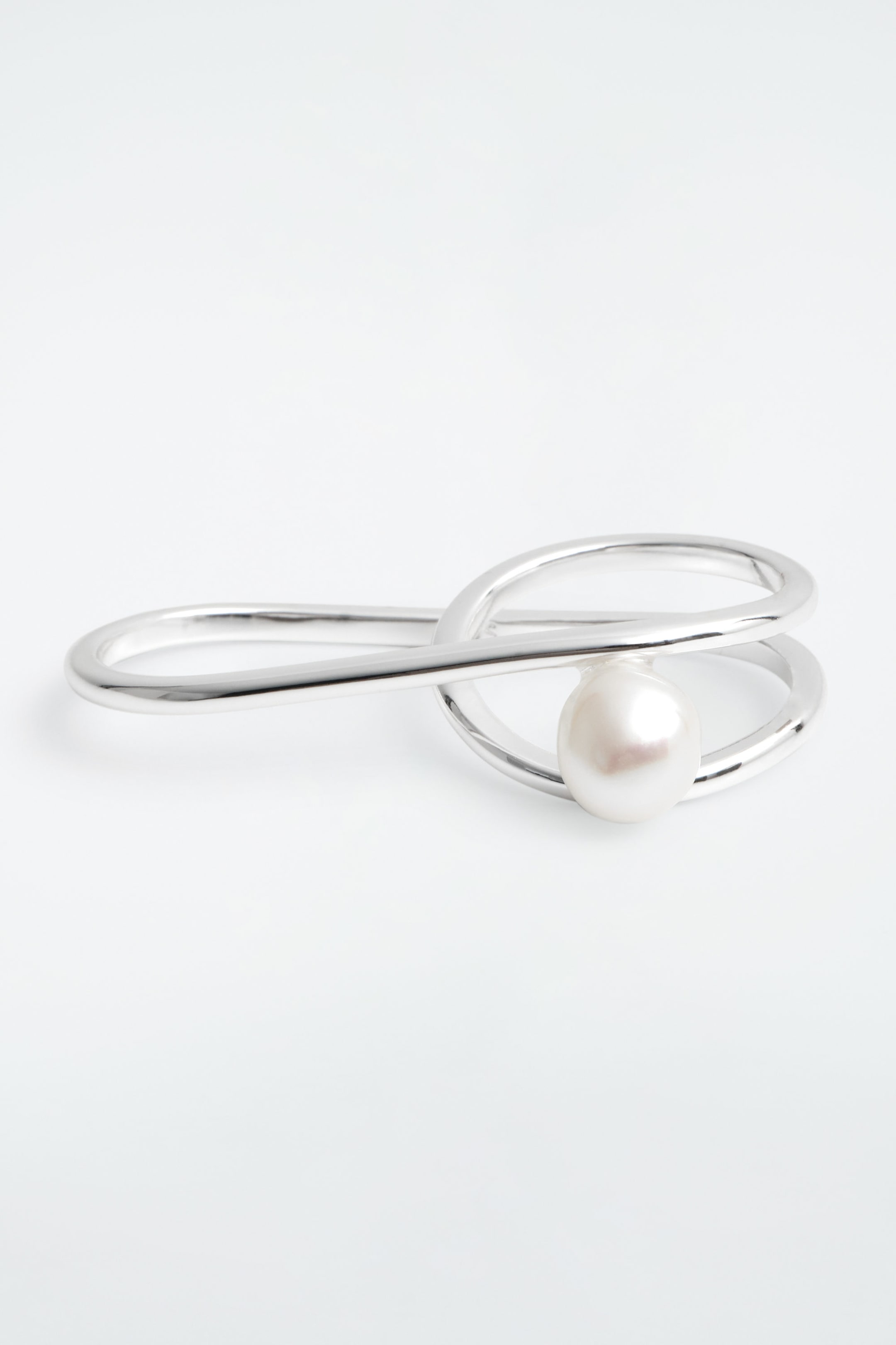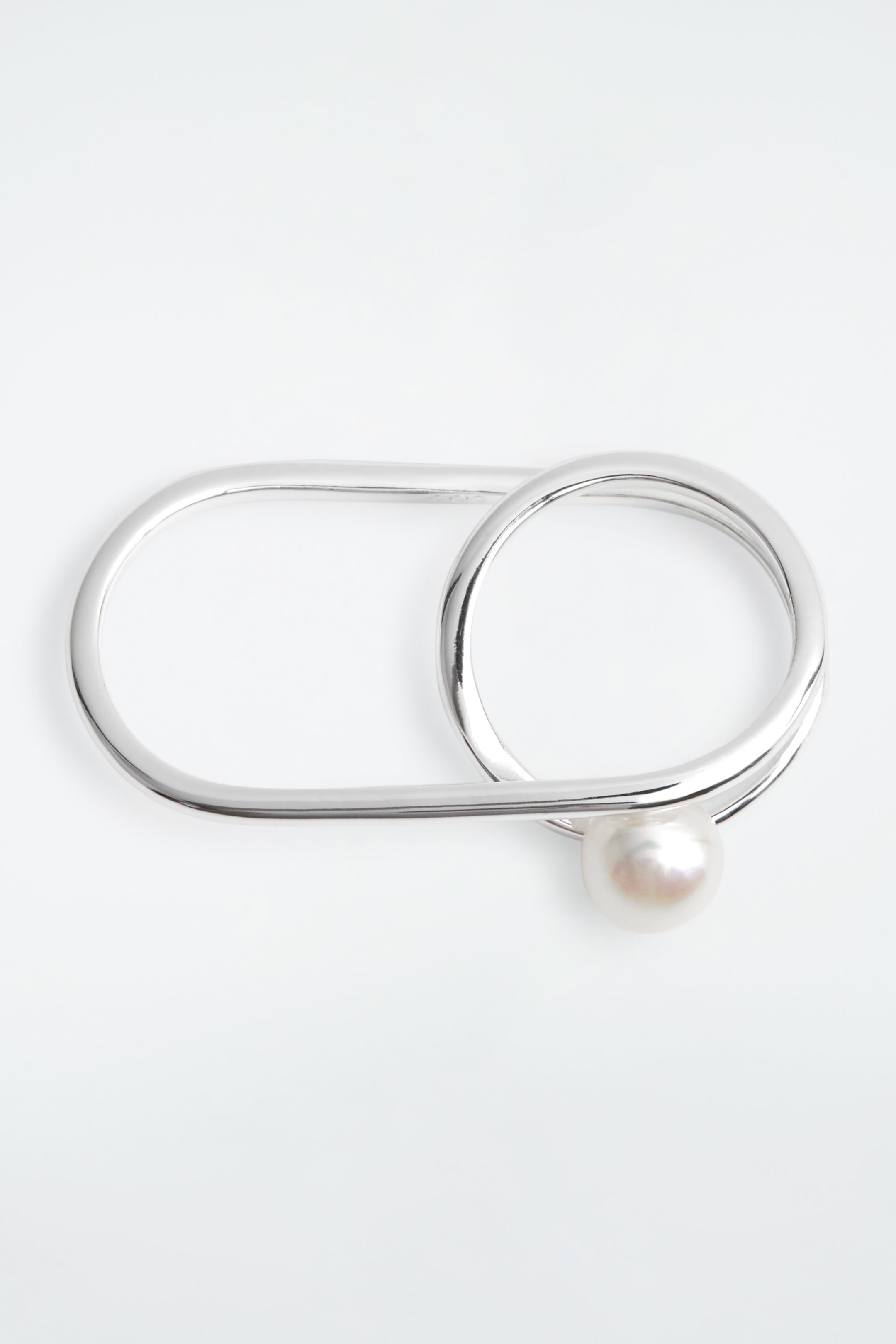 The sculpted lines and clean forms of this double ring channel a modern elegance. It's crafted from silver-plated recycled brass that's coiled and entwined with a baroque freshwater pearl. It'll make a unique addition to your jewellery collection.
