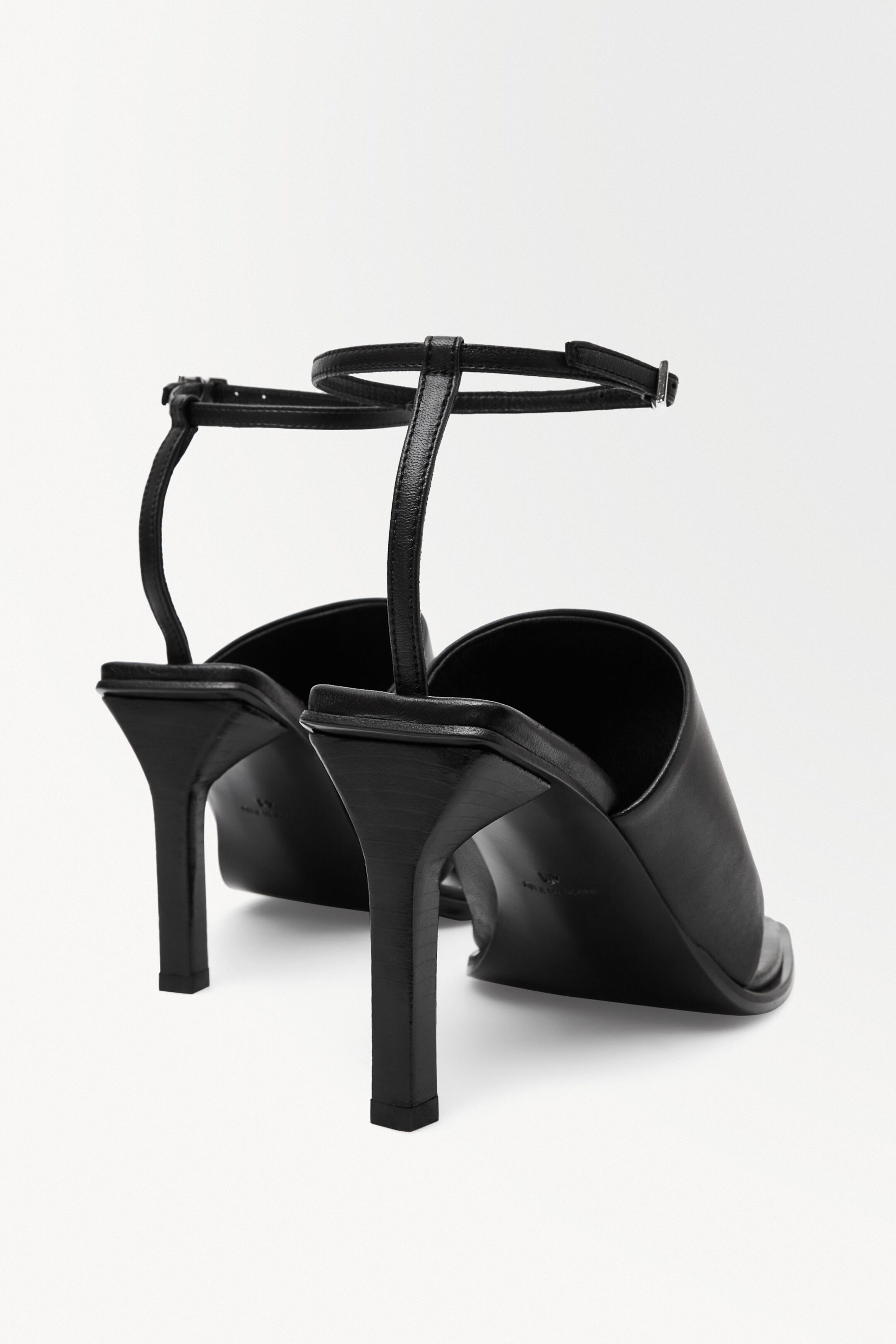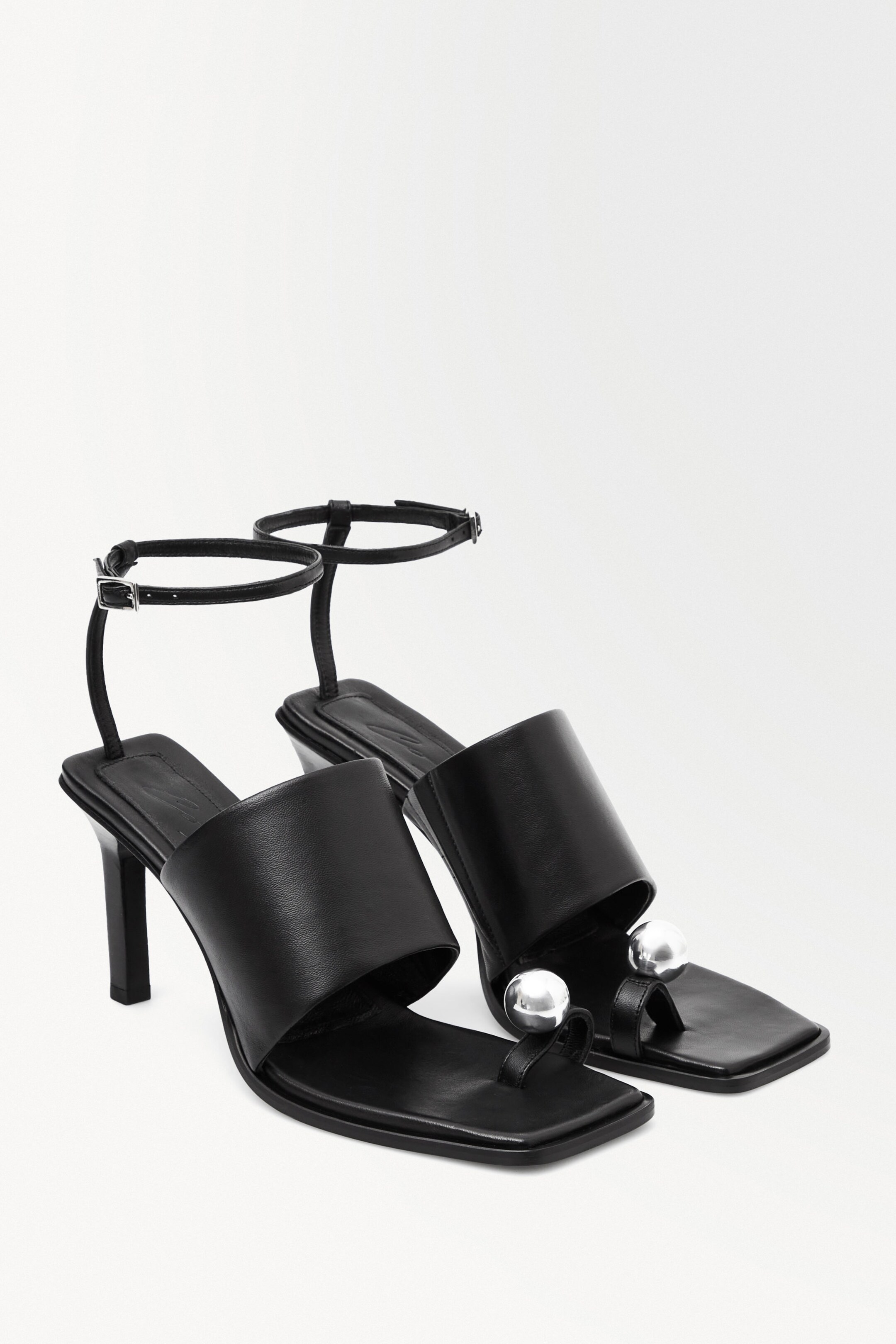 These striking sandals from the ATELIER collection are sure to be the focal point of your outfit. Set on towering stacked heels, they're designed with angular square toes, a slender ankle strap and a wide leather panel across the vamp that has a subtle elasticated pleat at one side for a non-constricting fit. Each toe strap is embellished with a shining silver-tone sphere – a signature of the jewellery in the collection.