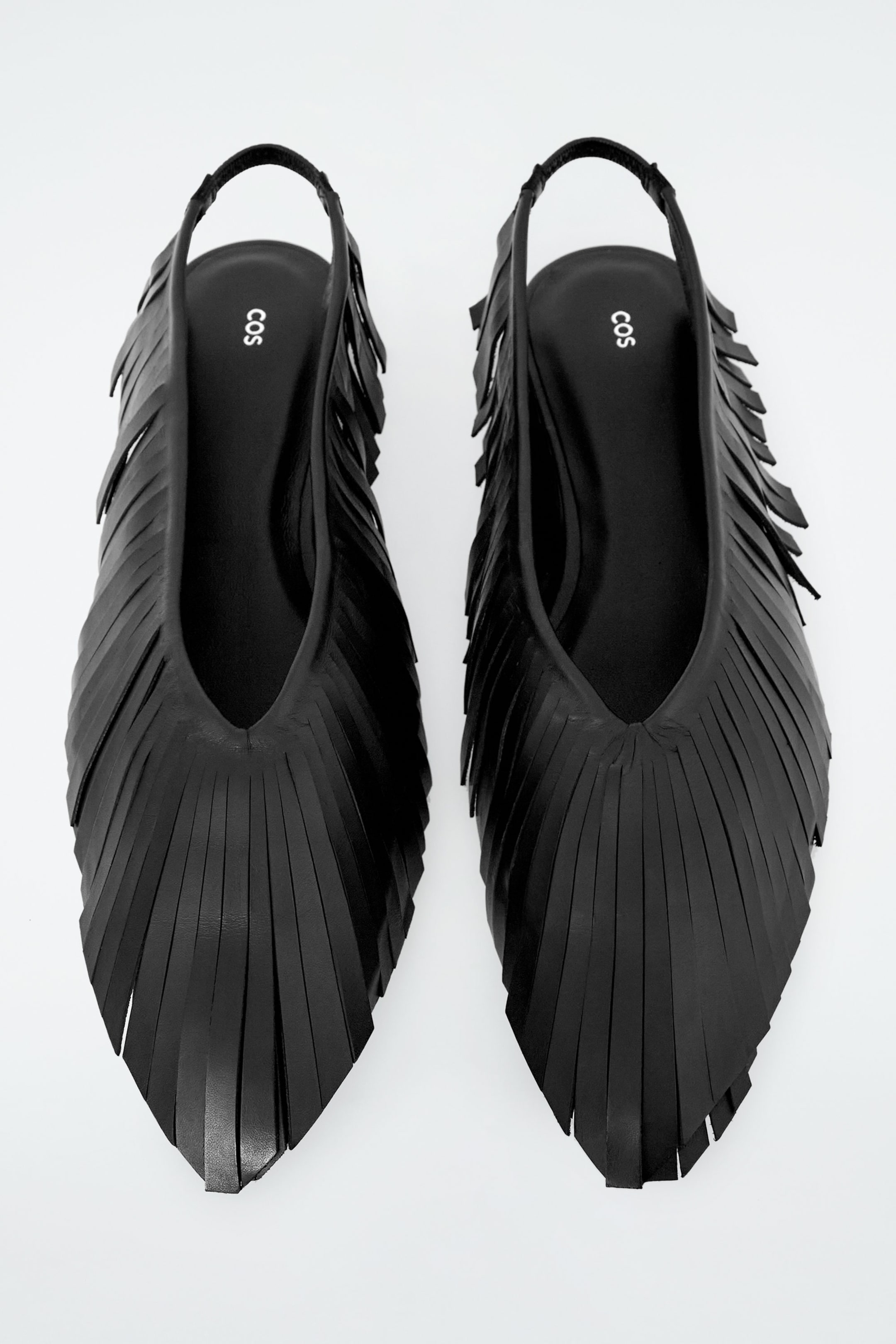 Playful silhouettes lead the COS footwear collection this season. Crafted from premium butter-soft leather, these ballet flats are adorned with tassels that amplify the pointed shape and V-shaped vamp. They are finished with an adjustable slingback strap.