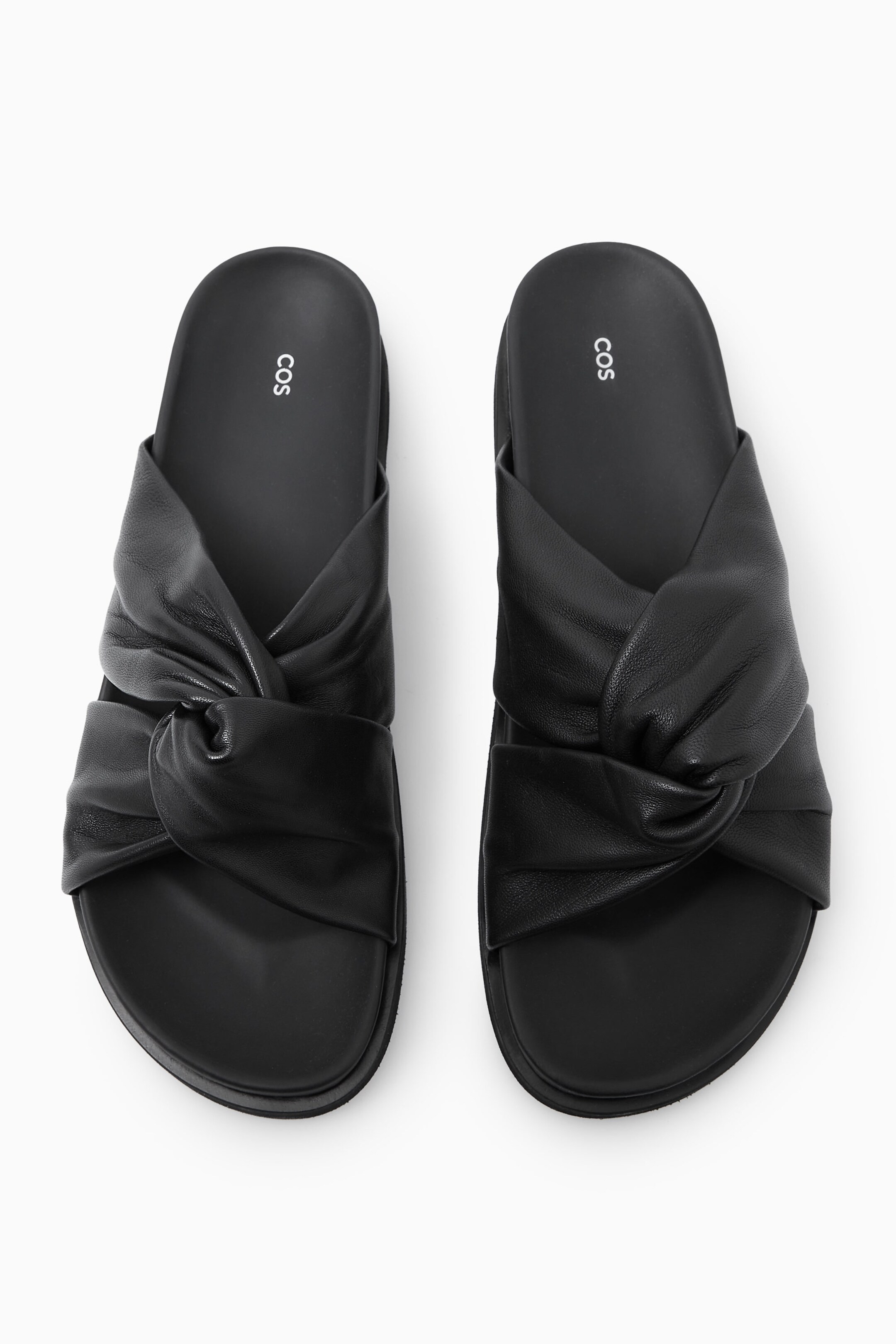 Offered in a refined black shade, these modern slides are crafted from supple chrome-free leather that's meticulously scrunched and folded to create crossover straps. They're set on comfortable moulded footbeds.