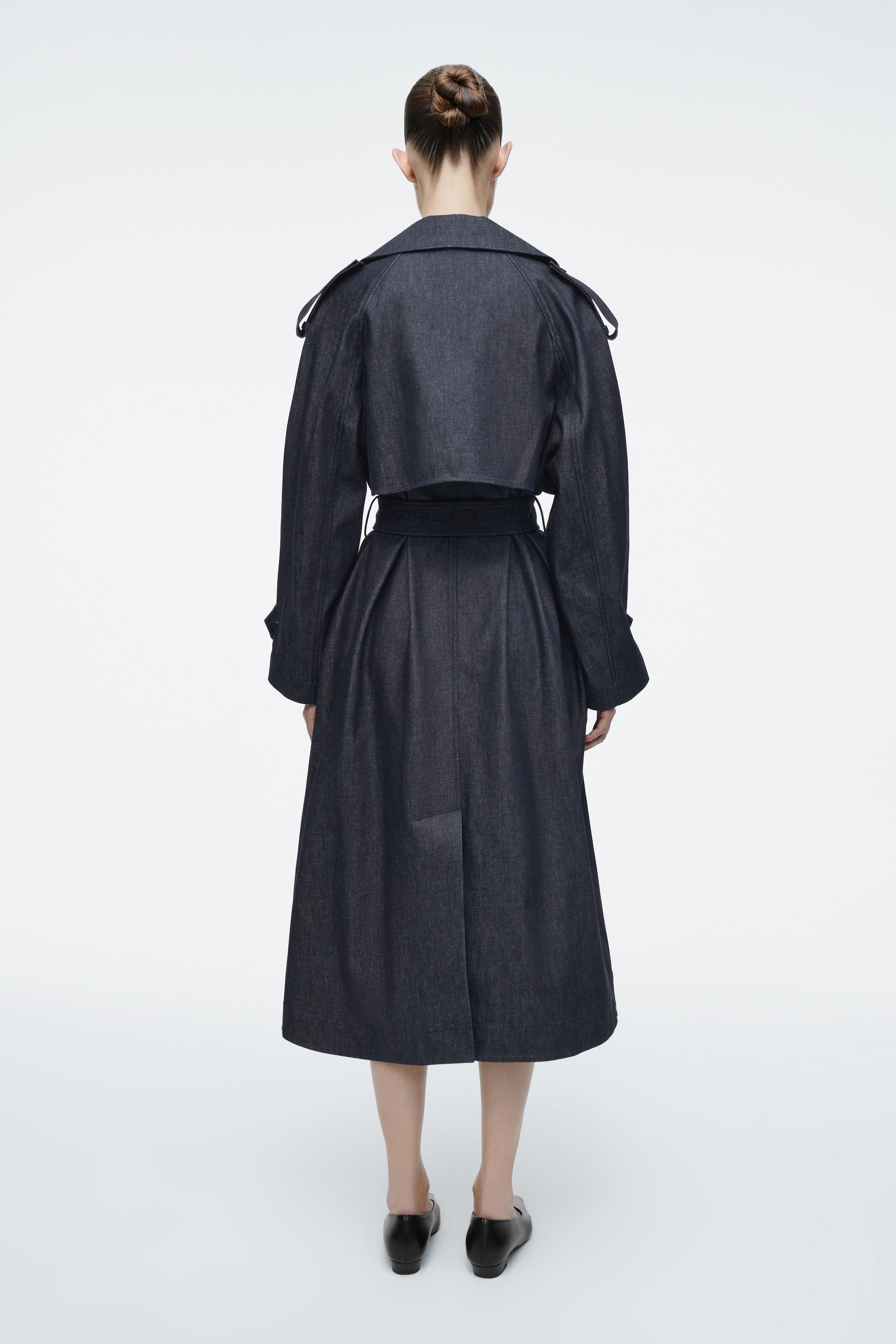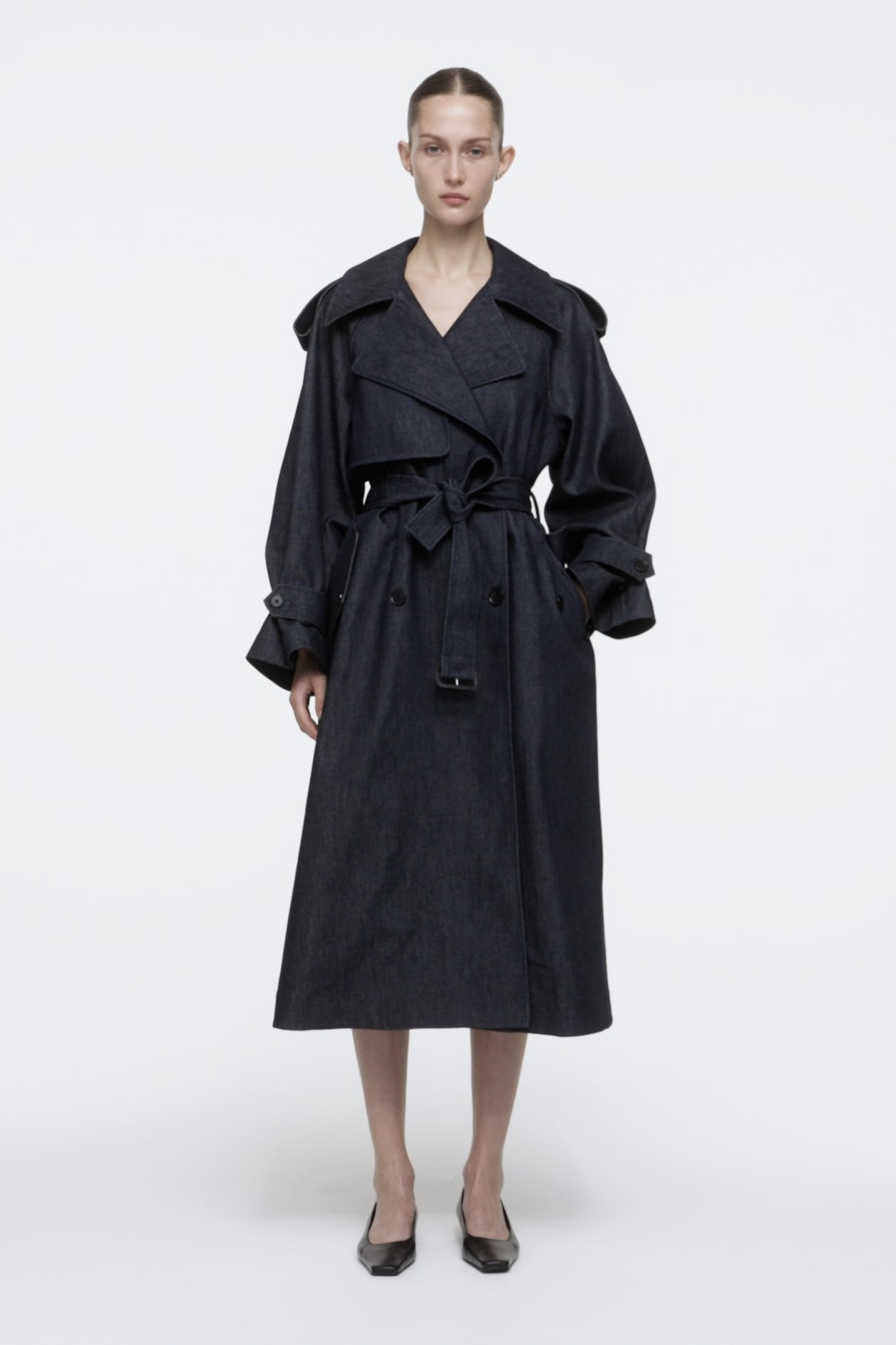 Modernising the classic trench, this piece is cut in an oversized shape and made from deep-indigo denim. Shaped with a double-breasted close, it's defined by a buckled belt at the waist and finished with storm flaps and buttoned cuff tabs.
