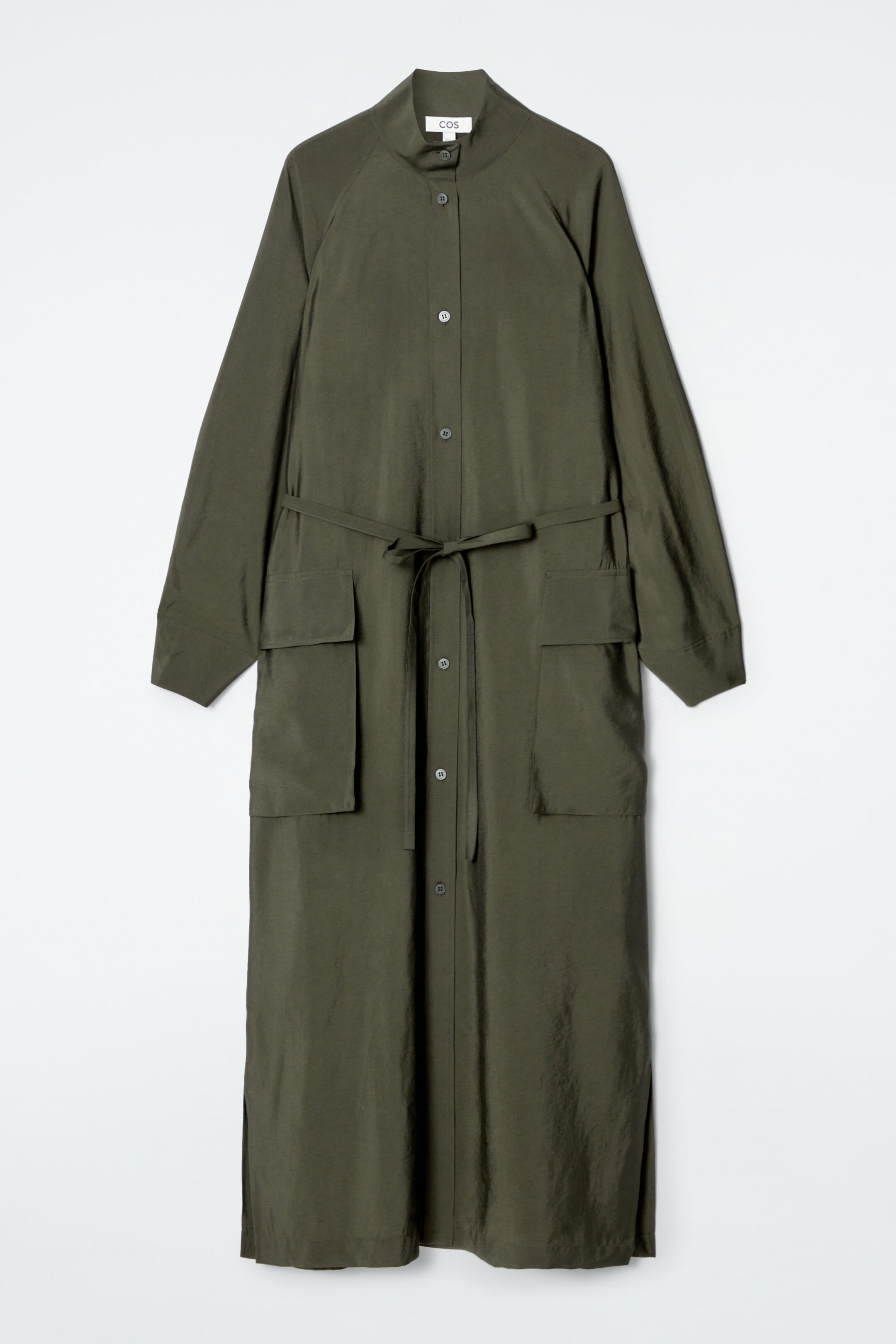This modern shirt dress draws from utilitarian codes. Rendered in a dark-olive tone, it's crafted from a TENCEL™ Modal blend that has a fluid drape and features a funnel neck, raglan sleeves and oversized flap pockets at either side. Use the tonal ties to subtly define the relaxed shape.