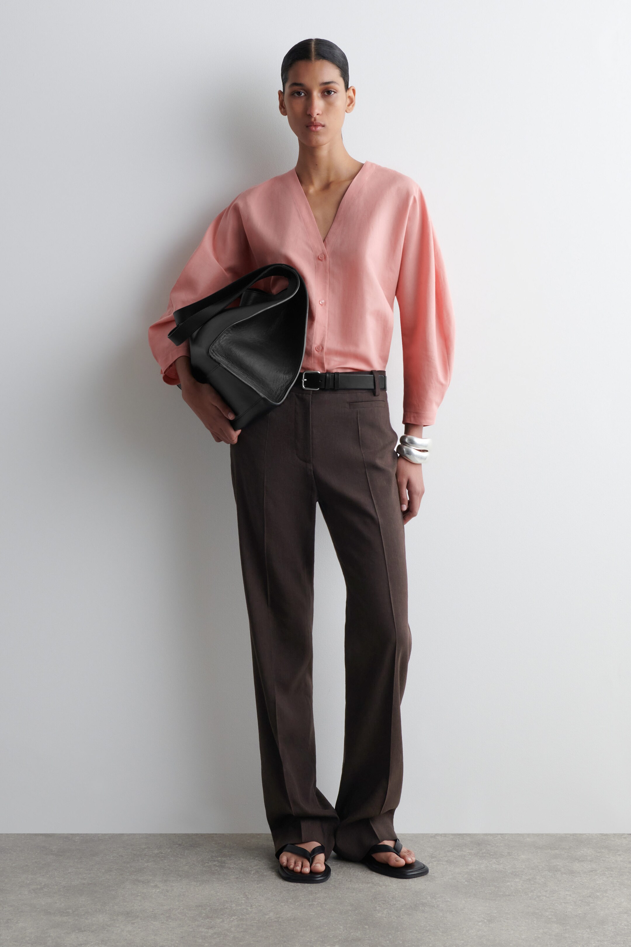 Rendered in a soft rose-pink hue, this modern shirt is made from linen that's blended with cotton for lightness. It's designed with a V-neckline, curved hem and adjustable tabs that create neat folds at each cuff. Style it with the matching trousers.