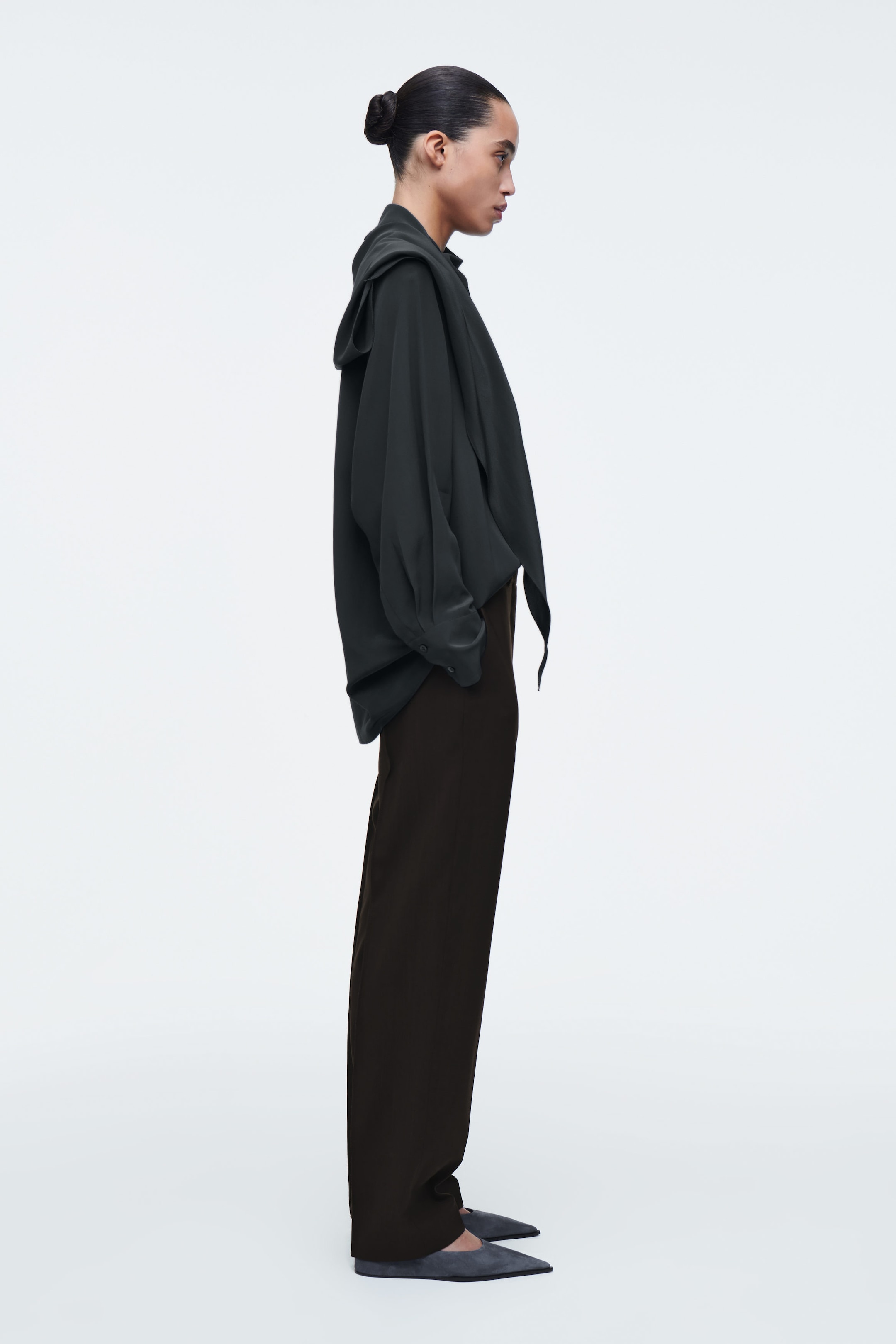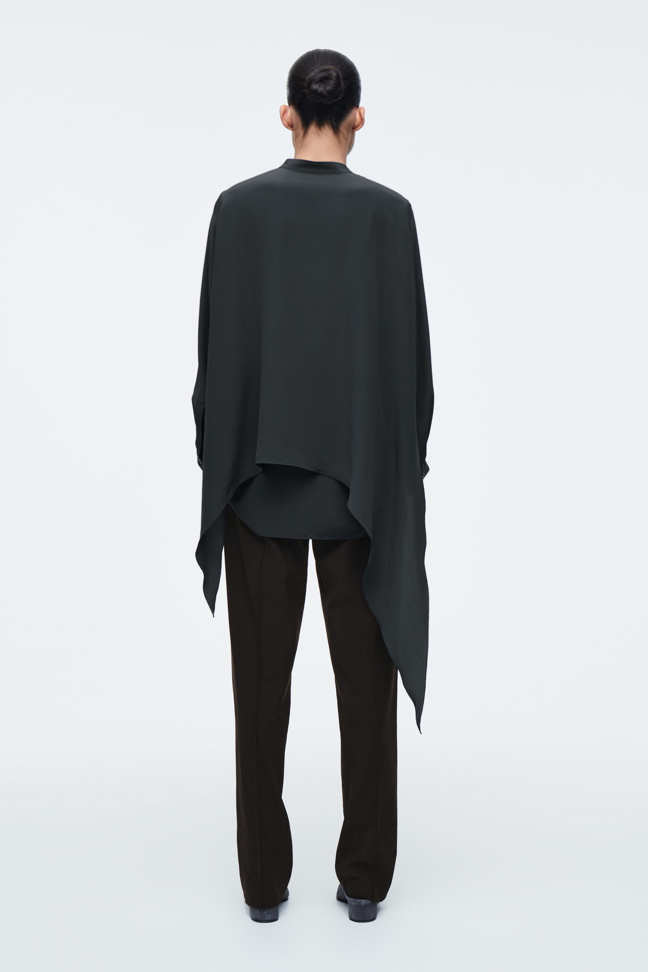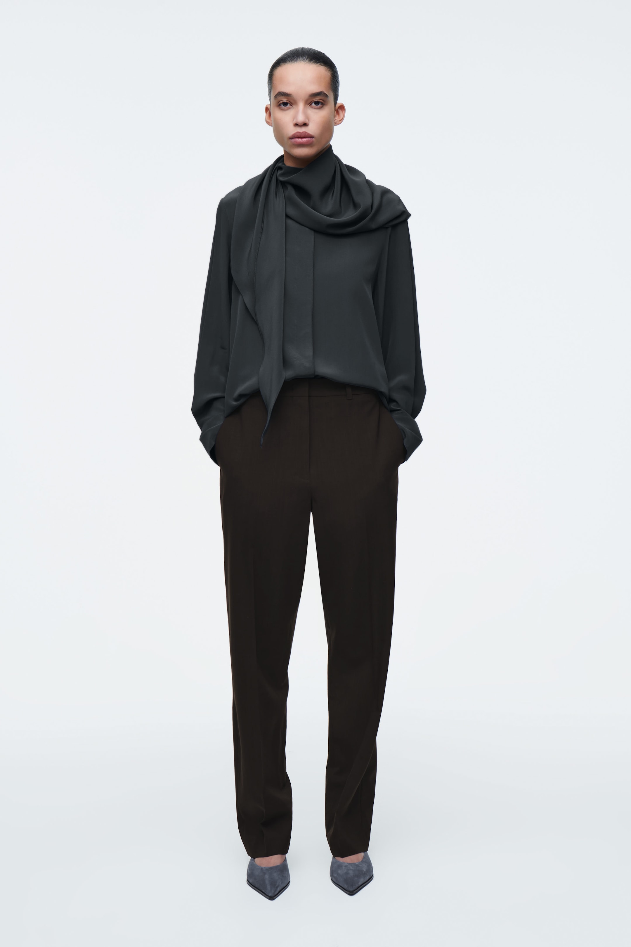 The COS SS25 runway collection builds on the house codes of lasting design and exceptional craftsmanship. A reimagining of classic shirting, this refined piece is made from luxuriously soft mulberry silk crepe de chine and features a scarf detail that can be tied at the front or draped effortlessly over one shoulder. The concealed mother-of-pearl placket is detailed with delicate tonal embroidery.