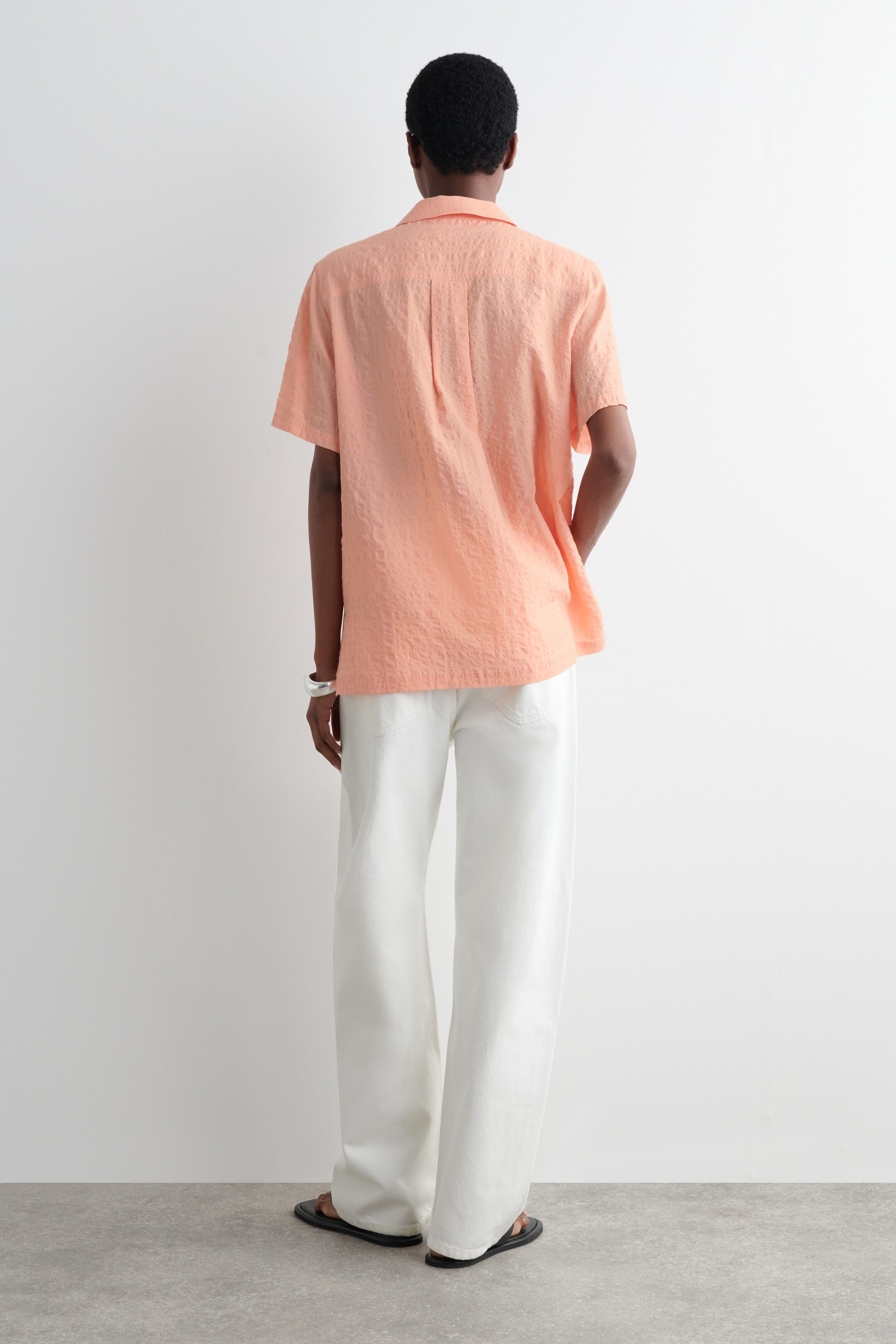 Imbued with an effortless appeal, this boxy resort shirt is crafted from a textured cotton blend in a muted apricot tone. It's cut in a relaxed shape and designed with a camp collar and short sleeves. Style it with denim or linen.