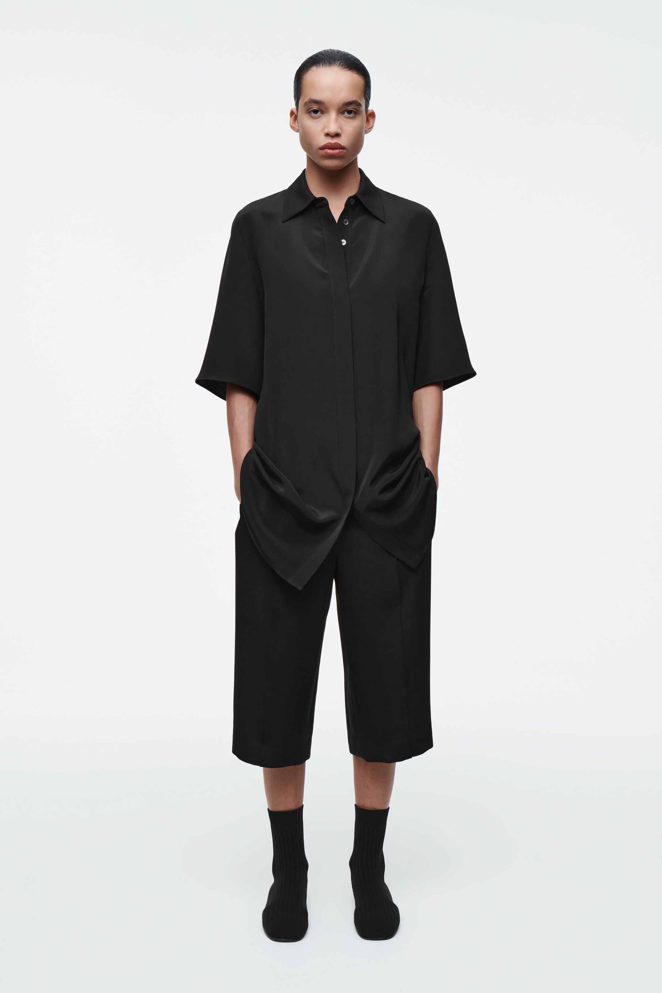 The COS SS25 runway collection builds on the house codes of lasting design and exceptional craftsmanship. Rendered in an enduring carbon tone, this short-sleeved shirt embodies a modern elegance – note the clean pointed collar, elongated shape and mother-of-pearl buttons. The 100% mulberry silk-crepe cloth was selected for its luxuriously soft handle and effortless drape. Style it with the matching shorts.