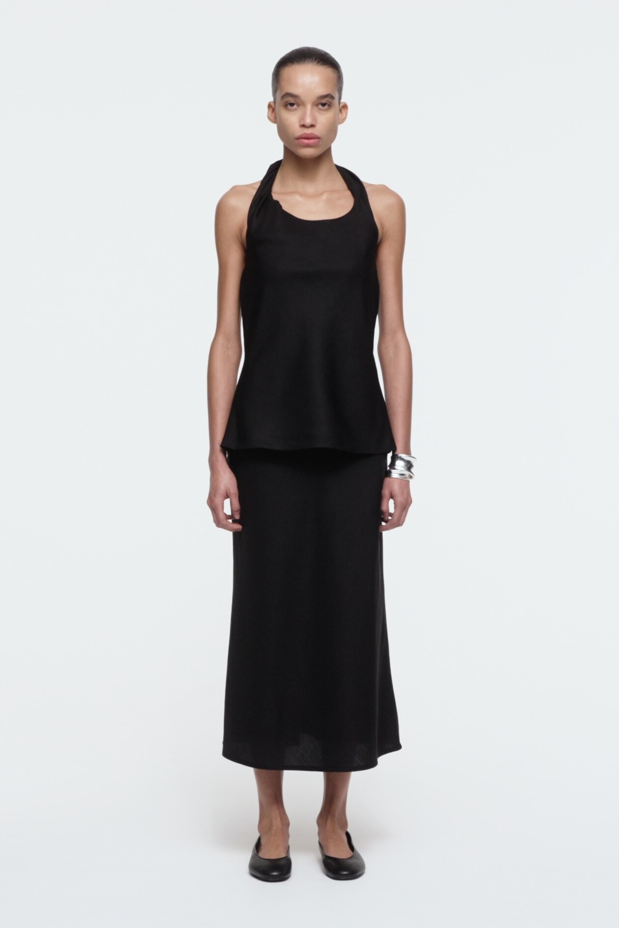 A prelude to the warmer months, this bias-cut midi skirt is crafted from a lightweight TENCEL™ Lyocell and linen blend that lends itself to balmy weather. It's offered in a classic black hue and shaped in a straight, column silhouette. Style it as a set with the matching top.