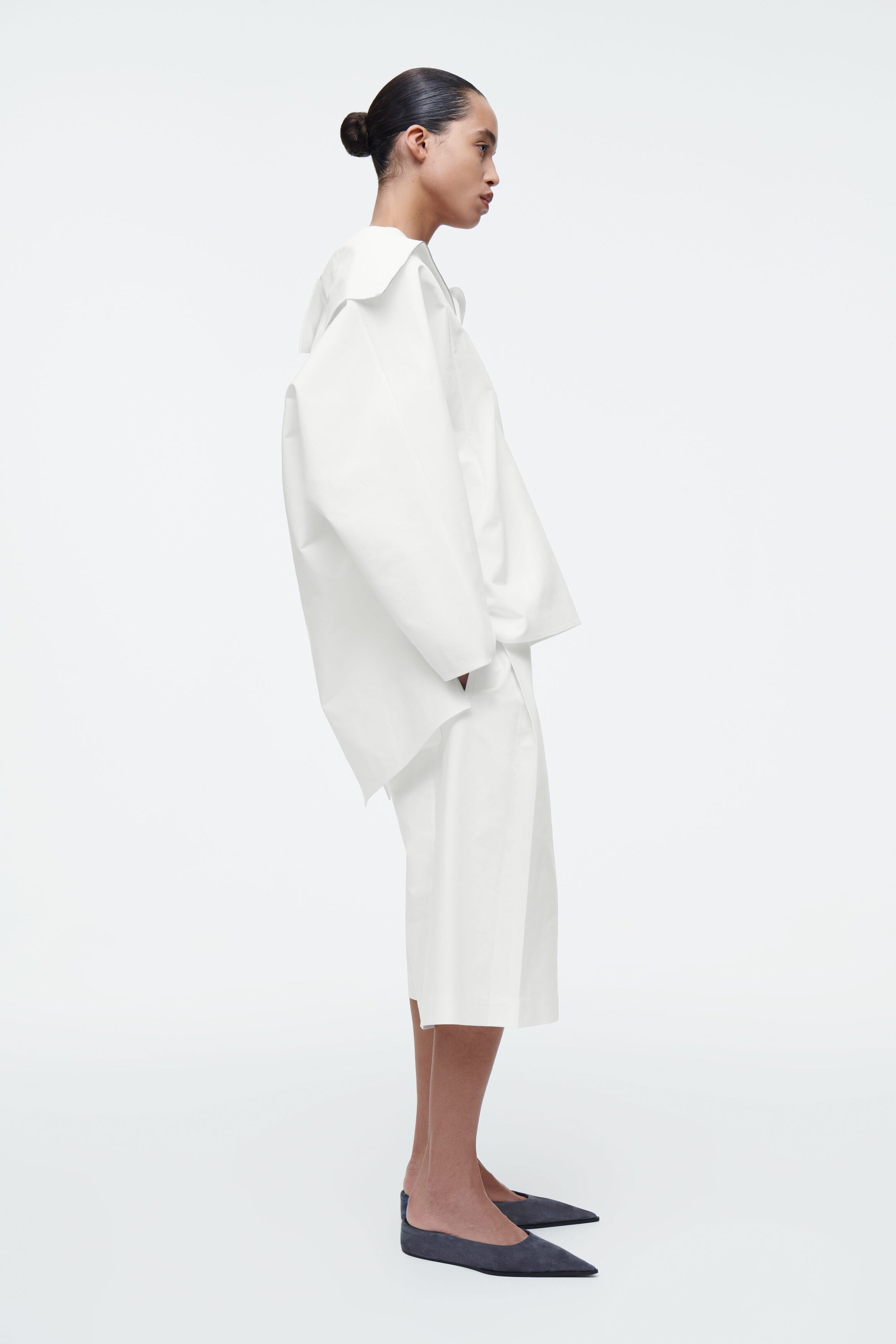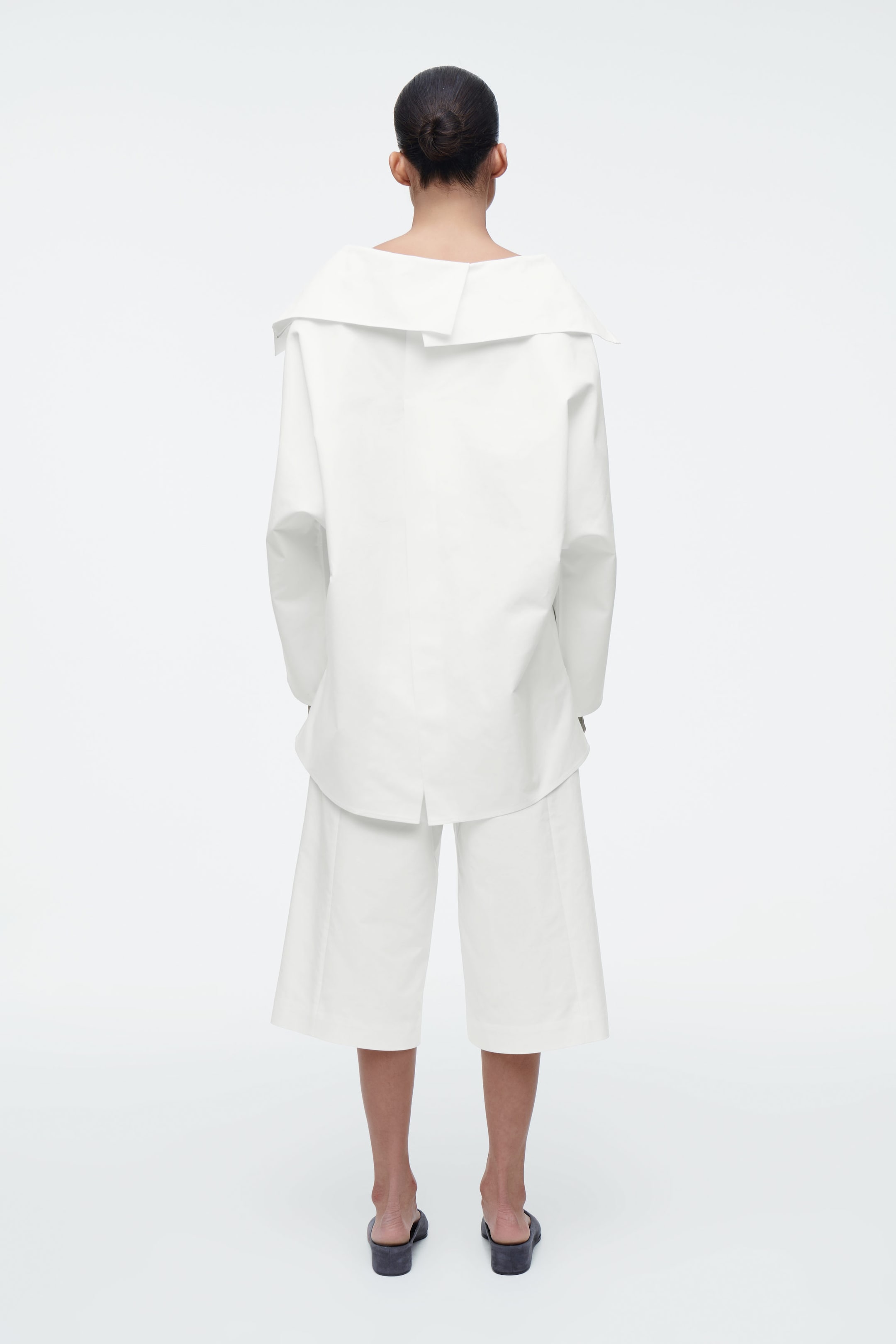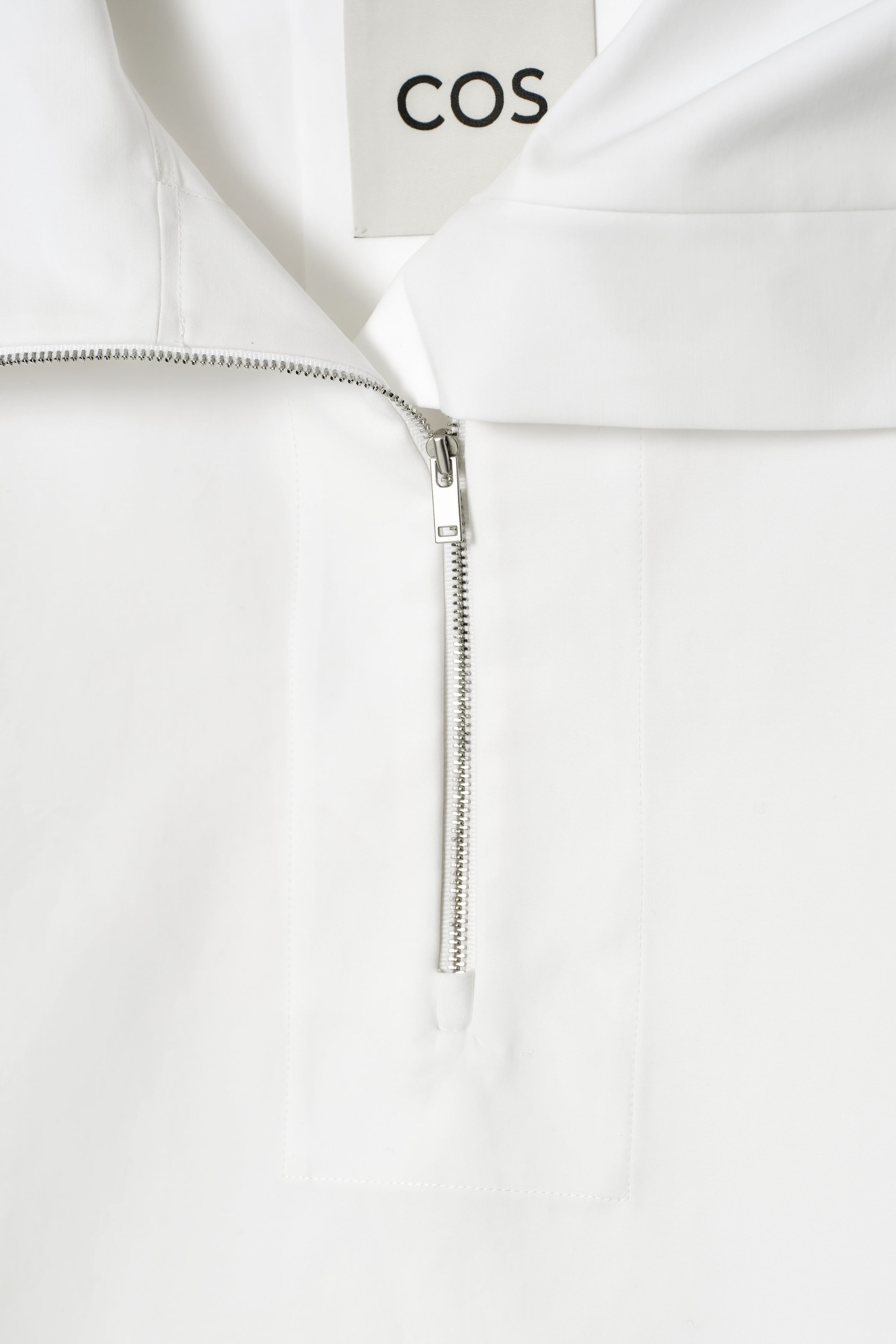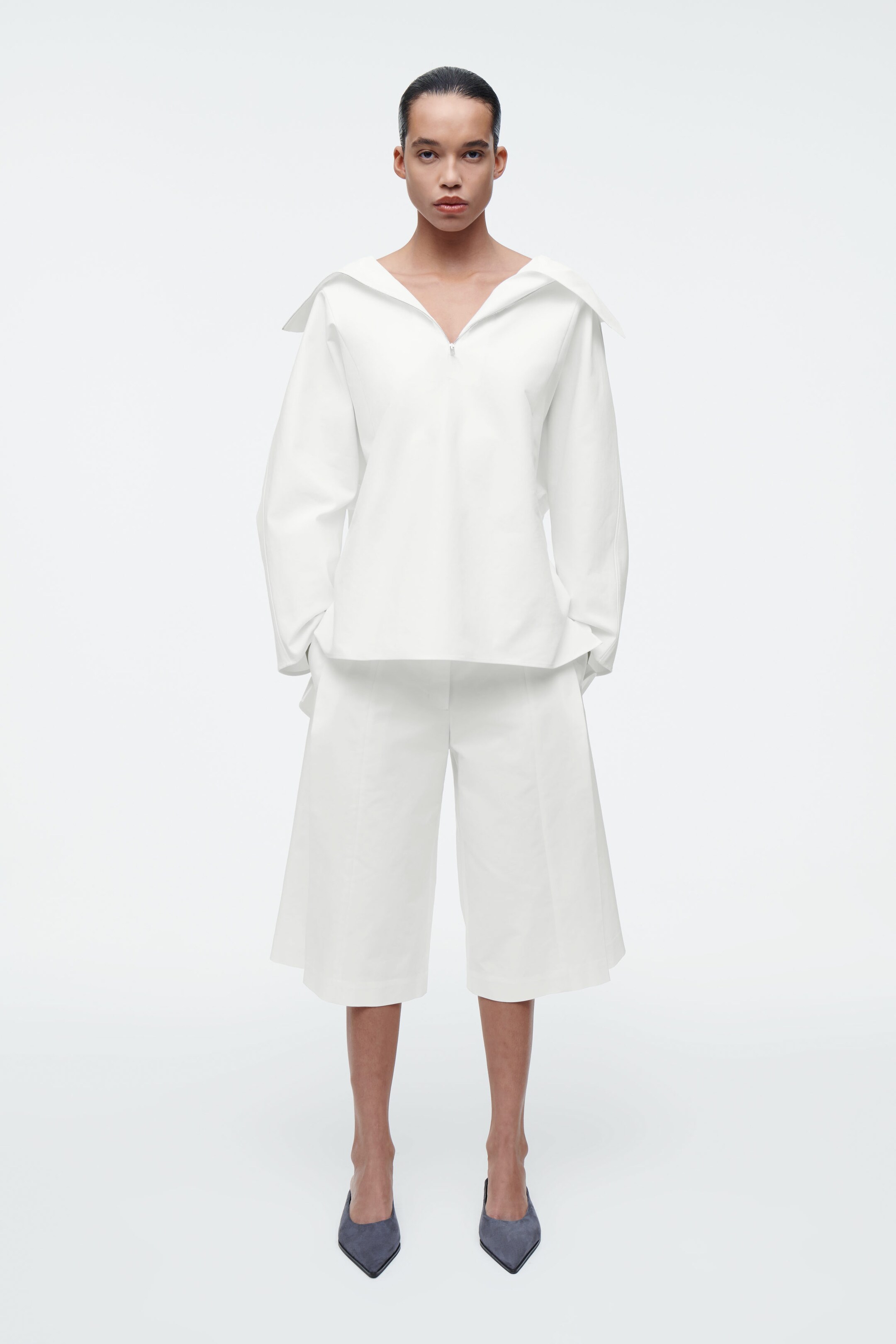 The COS SS25 runway collection builds on the house codes of lasting design and exceptional craftsmanship. Blending understated utility with a modern view on Renaissance, this half-zip blouson shirt is cut in a billowing shape with silver-tone metal accents and an elongated vent at the back. It's made from crisp cotton and has an oversized collar that can be styled as a funnel neck or folded down over the shoulders. Wear it as a coord with the matching shorts.