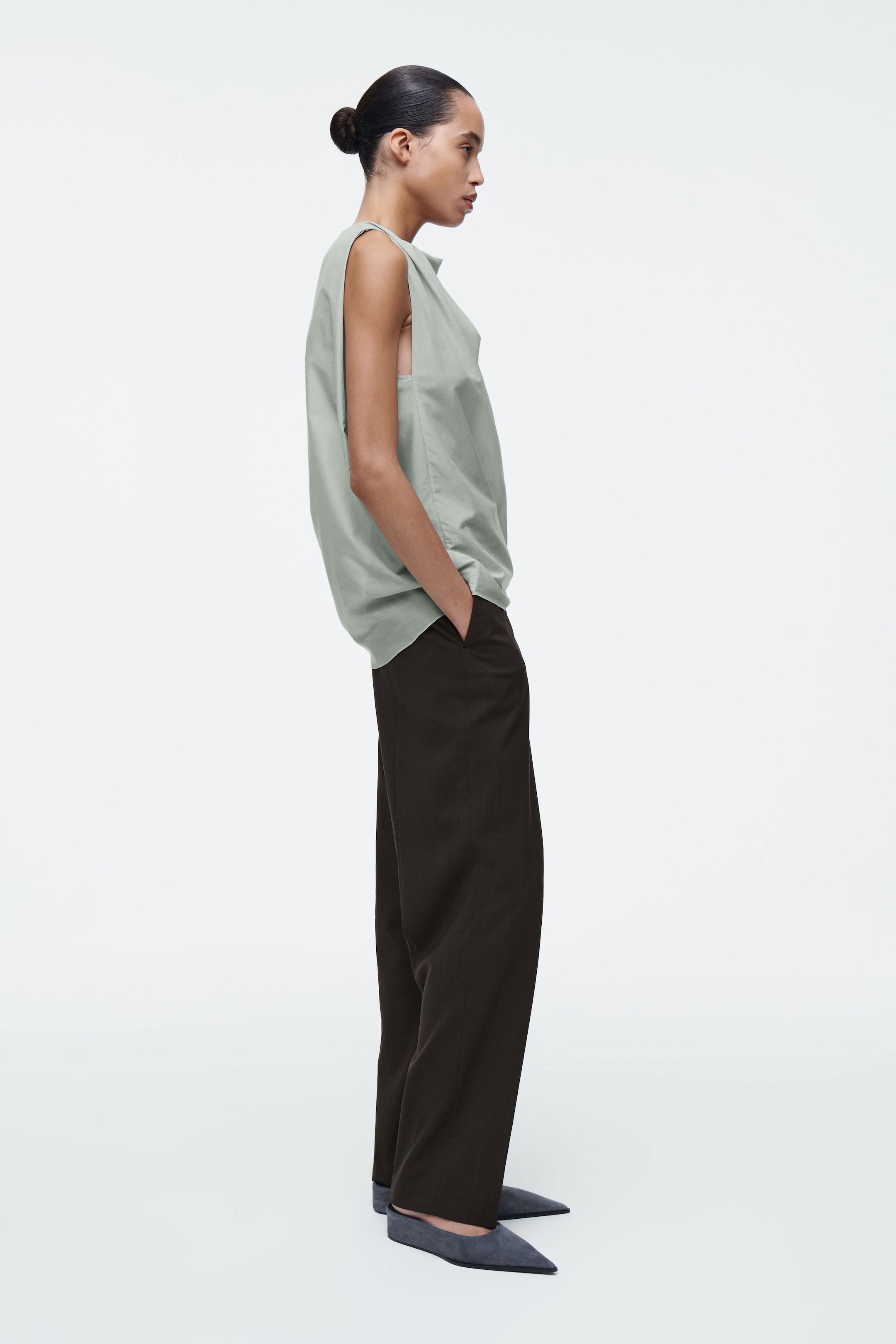 The COS SS25 runway collection builds on the house codes of lasting design and exceptional craftsmanship. Draped on the stand in our atelier, this refined top is artfully twisted from each shoulder, creating an effortless silhouette that translates from day to evening. The sheer cotton-silk cloth is rendered in a subdued mist-grey tone that underpins the capsule.