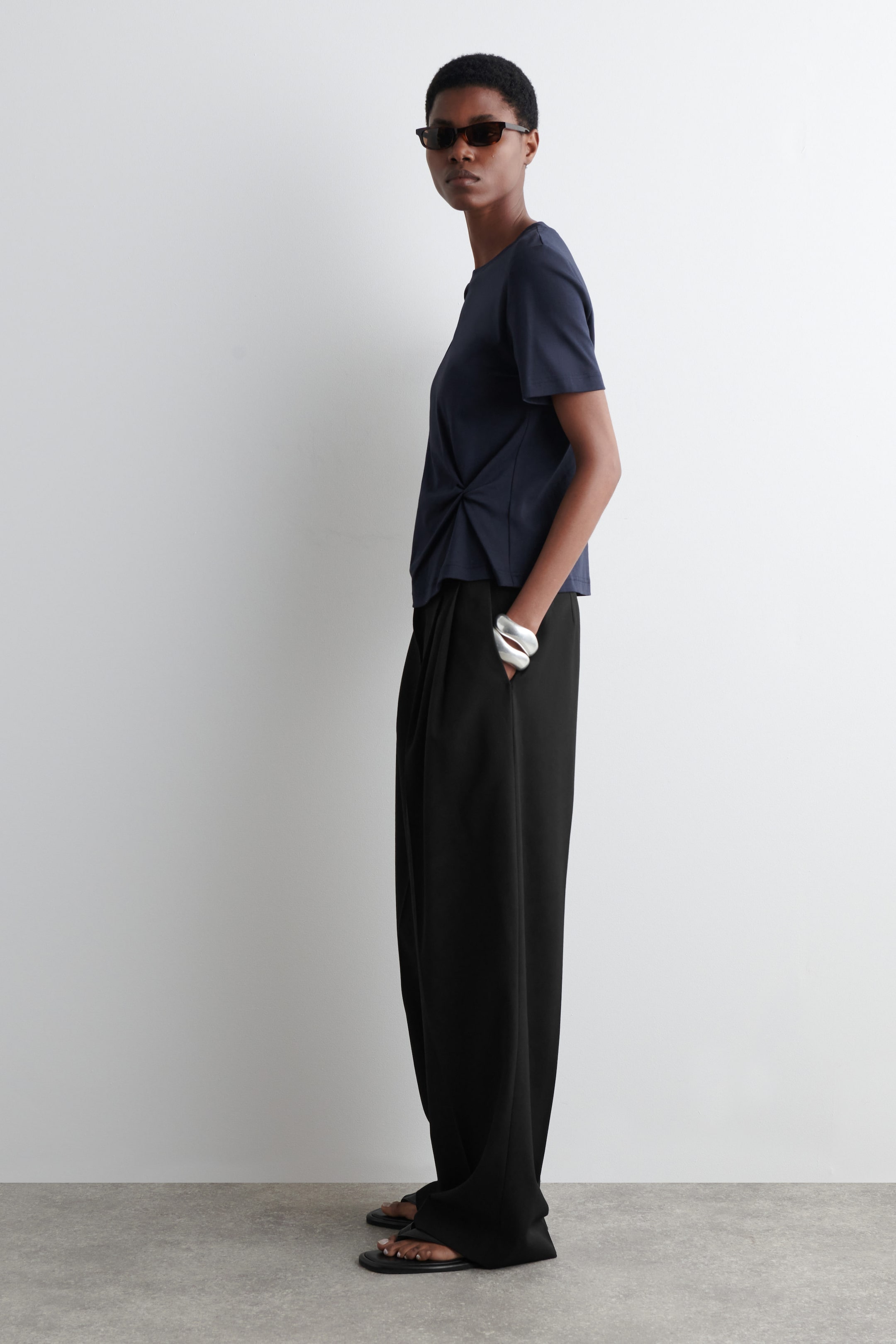 Reimagining the classic T-shirt, this piece is designed with knotted details that subtly define the shape. It's crafted from soft cotton-jersey in timeless navy and has a ribbed crew neckline.