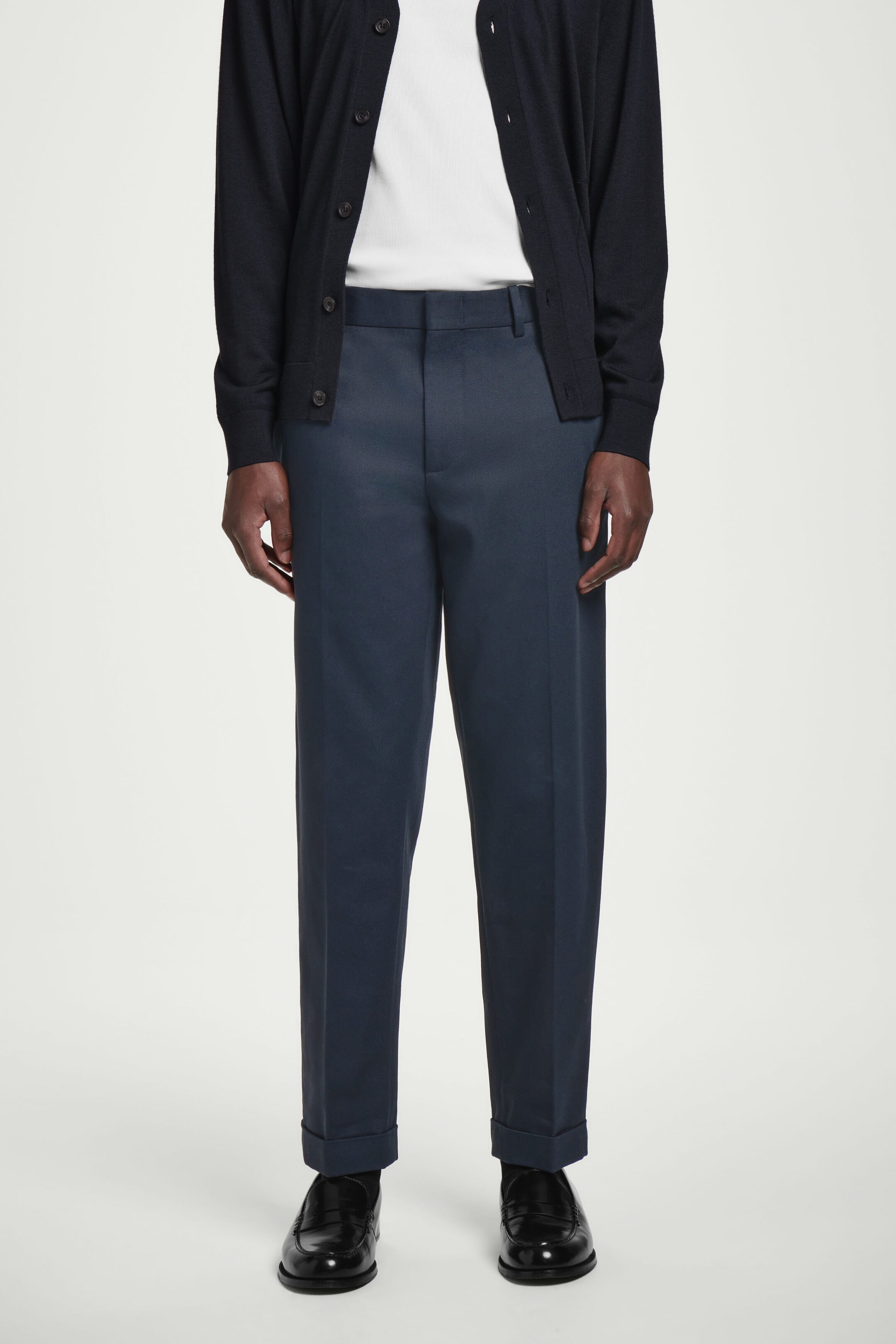 Crafted from pure cotton twill, these trousers are expertly tailored with tapered legs. They're offered in versatile navy and are perfect for smart-casual dress codes with their sharp pressed creases and relaxed turn-up cuffs, which will nicely highlight your Derbies or loafers.