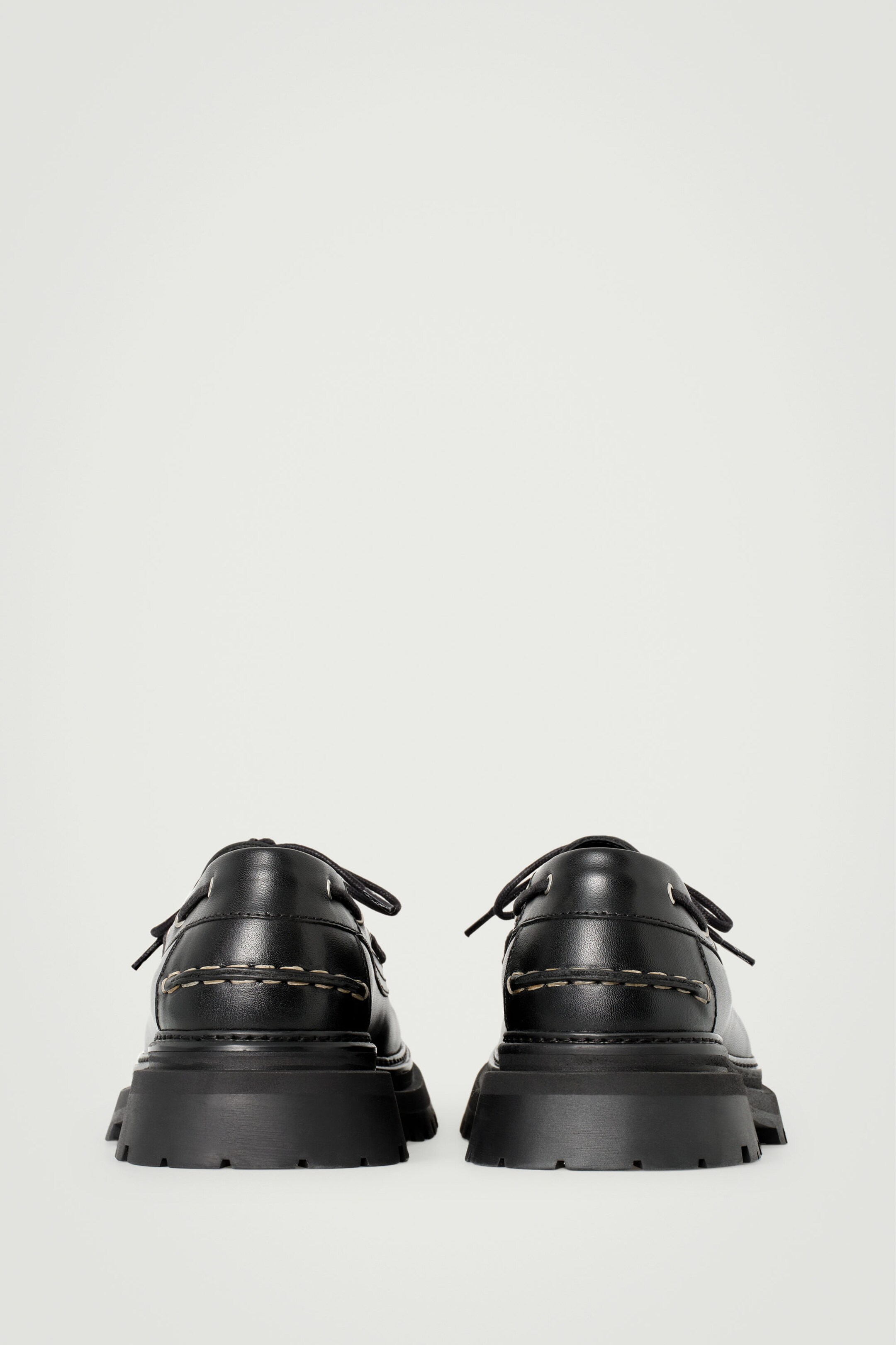 Crafted from polished chrome-free leather, this pair marries the classic boat-shoe shape with chunky soles for contemporary appeal. They're threaded with waxed-cotton laces and finished with contrasting top stitching, as well as leather threading around the edge that is signature to boat shoes.
