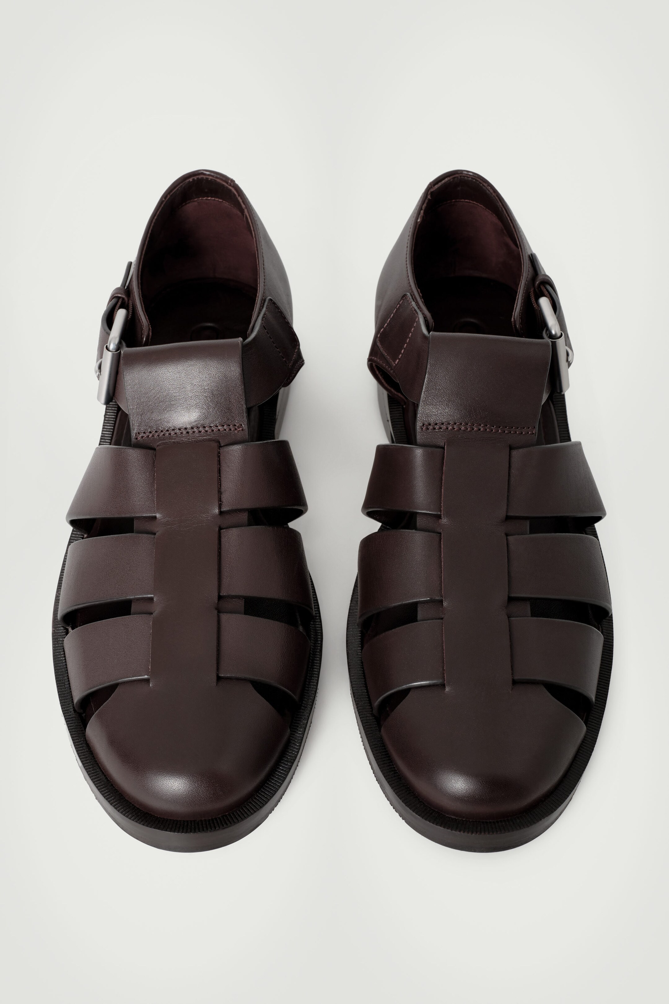 A reimagined classic, these fisherman sandals are crafted from supple chrome-free leather in a versatile espresso tone. They feature interwoven straps with semi-enclosed, rounded toes and a low, stacked heel. Style them with tailoring for laid-back appeal.