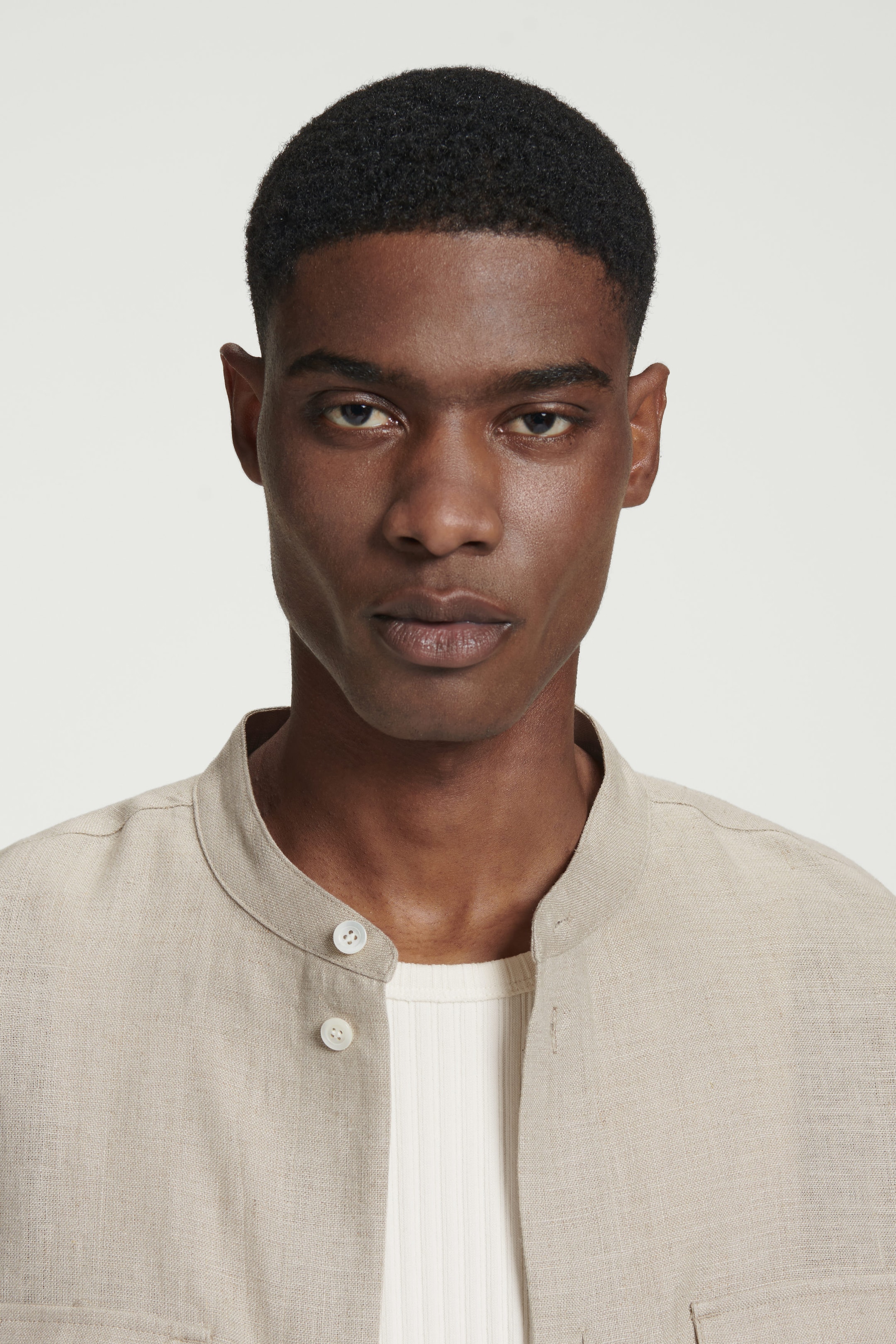 Designed with nods to utility, this modern shirt is crafted from naturally airy linen in an earthy beige tone. It's cut in a relaxed shape and features a grandad collar and angular chest flap pockets. Style it with the matching shorts.
