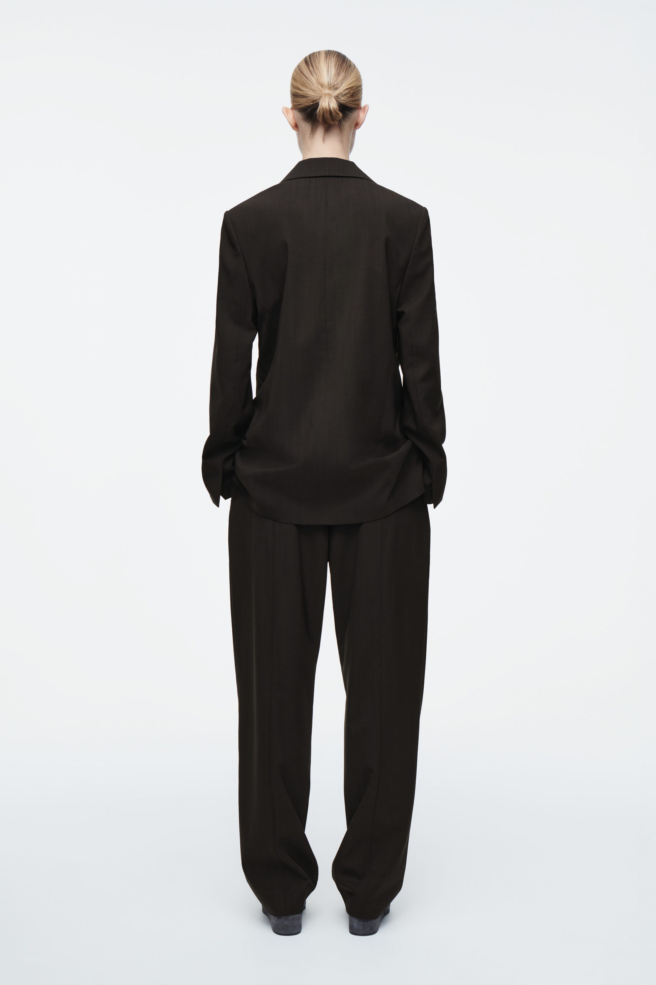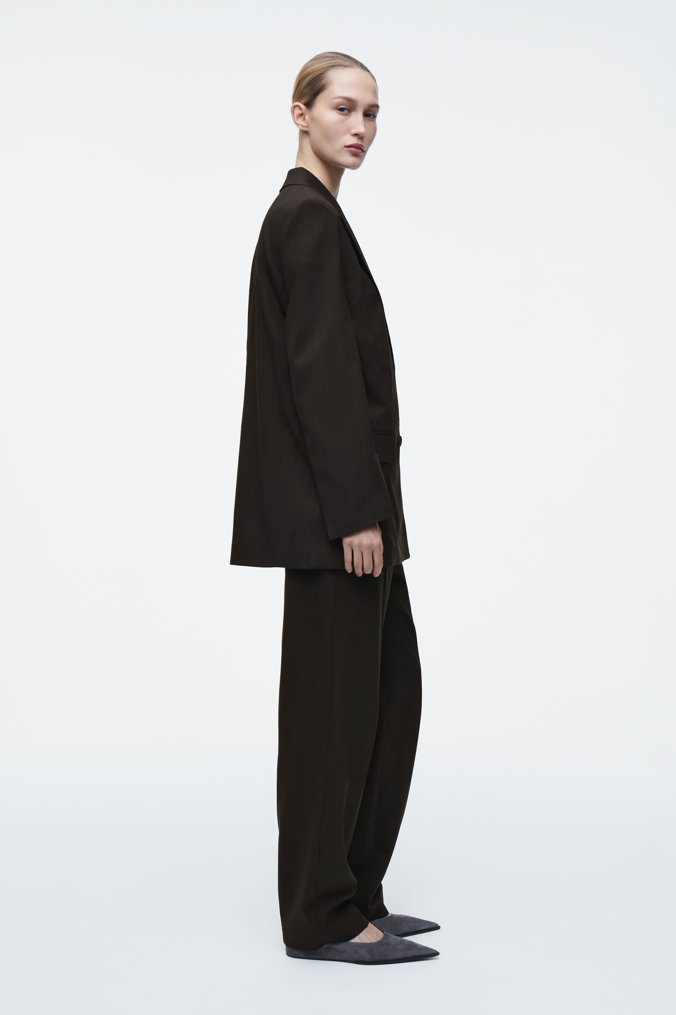 The COS SS25 runway collection builds on the house codes of lasting design and exceptional craftsmanship. A hallmark of impeccable tailoring, this double-breasted blazer is made from a premium wool suiting cloth – chosen for its lightweight handle and natural texture – and tailored in a classic shape that's made modern by the sharp peak lapels and elongated double-breasted silhouette. The grosgrain hanger loop is a signature of the capsule. Style it as a suit with the matching trousers.