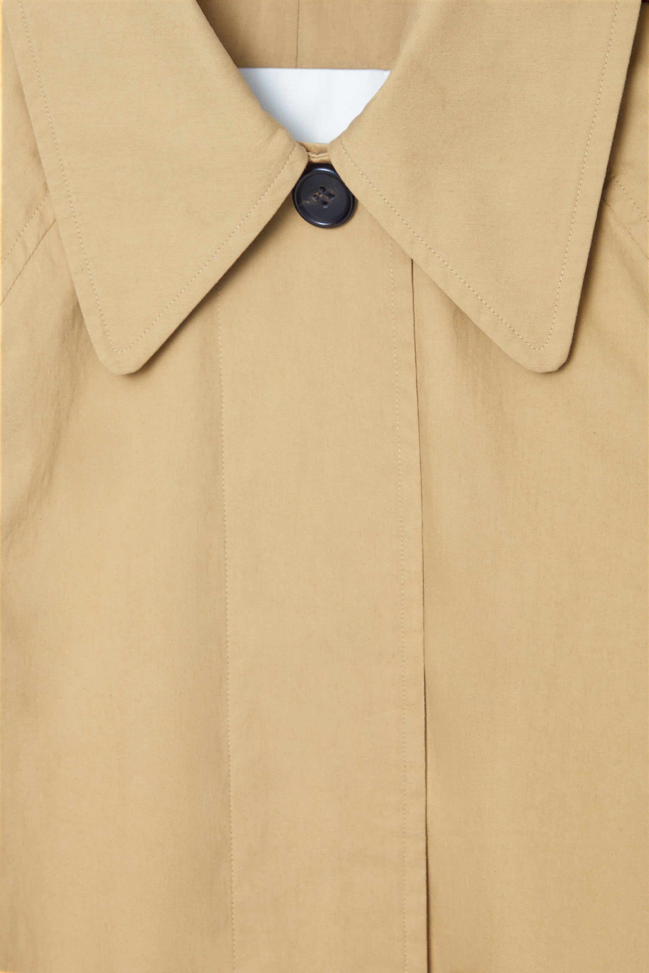 Modelled on a piece from the COS archives, this trench leans classic but is modernised with subversive touches. Made from a cotton blend in timeless beige, it's cut in a short length and designed with a directional scarf-tie hood that can be detached for more hopeful forecasts. A deep box pleat through the back lends volume.