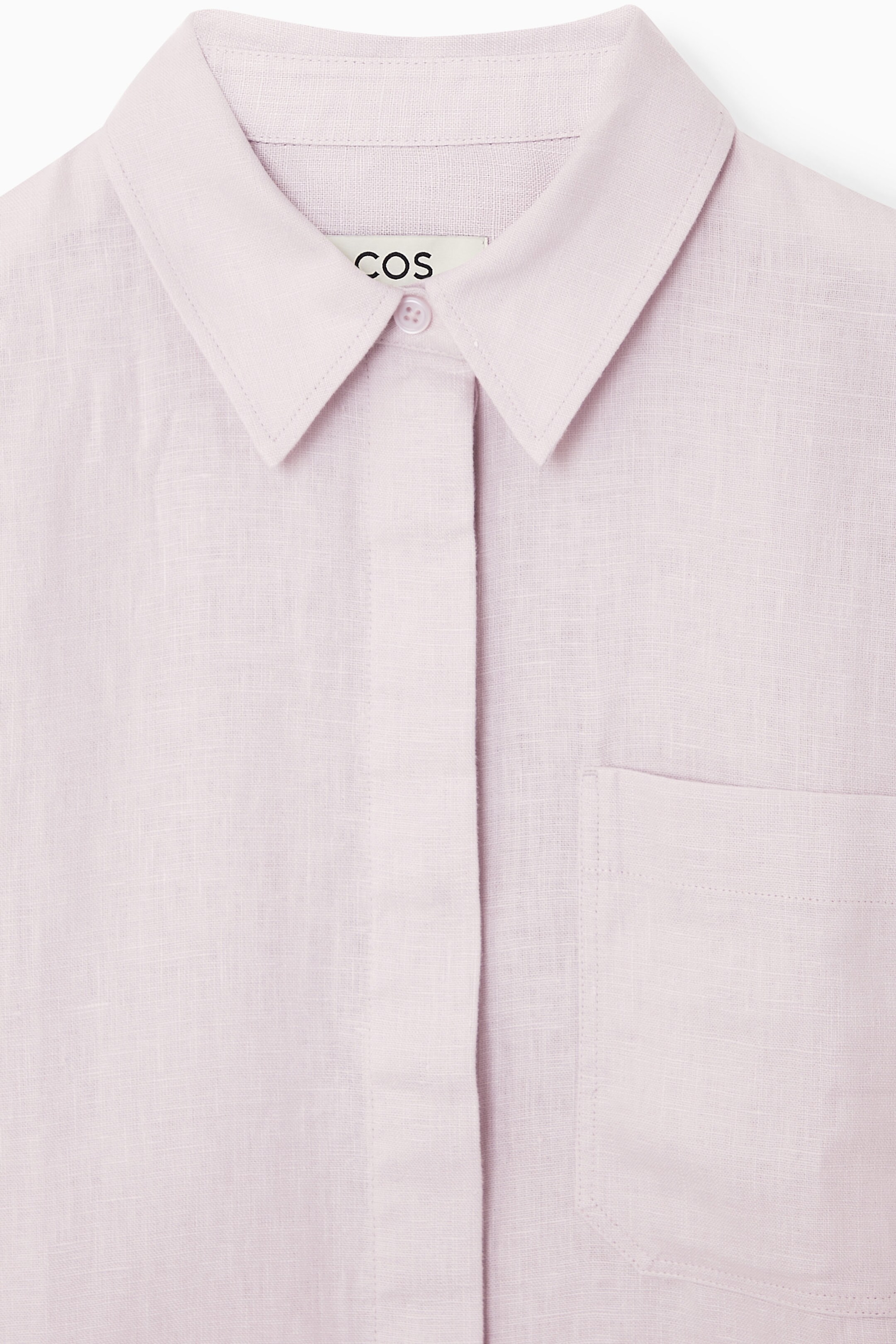 Offered in a fresh lilac hue, this classic shirt is crafted from pure linen that's breathable, lightweight and has natural texture. It's cut in an oversized shape that's perfect for wearing over tanks when the temperatures rise and designed with a pointed collar, patch pocket and a curved, stepped hem. Style it as a coord with the matching trousers, or choose the short-sleeved shirt on balmy days.