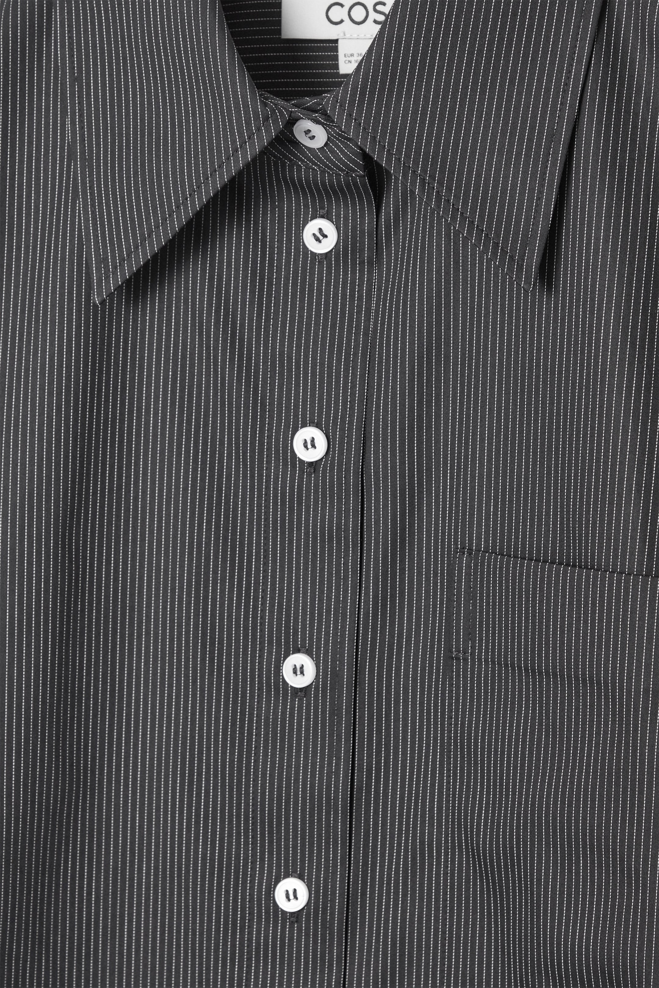 A staple of the COS womenswear collection, this shirt is crafted from crisp cotton-poplin and decorated with slender pinstripes. It's tailored for an oversized shape that's enhanced by the curved hem and designed with a sharp pointed collar, long sleeves and a patch pocket at the chest.
