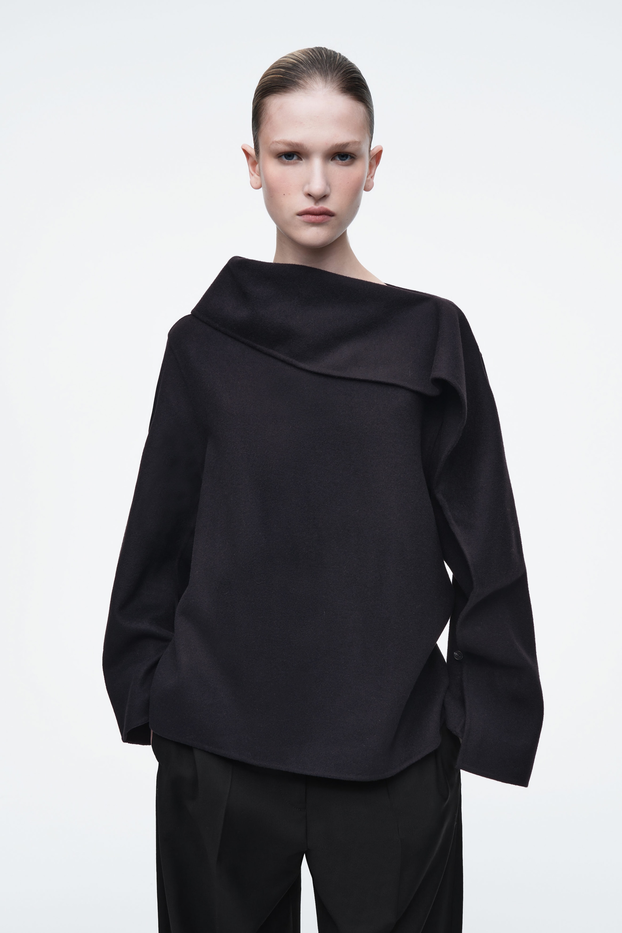 The asymmetric lines of this midnight-hued top channel a modern elegance. It's crafted from RWS wool and TENCEL™ Lyocell that's double-faced for a premium finish and has a softly draped panel that starts from the neckline and flows down one sleeve before buttoning at the wrist. Style it with navy pieces for a tonal look.
