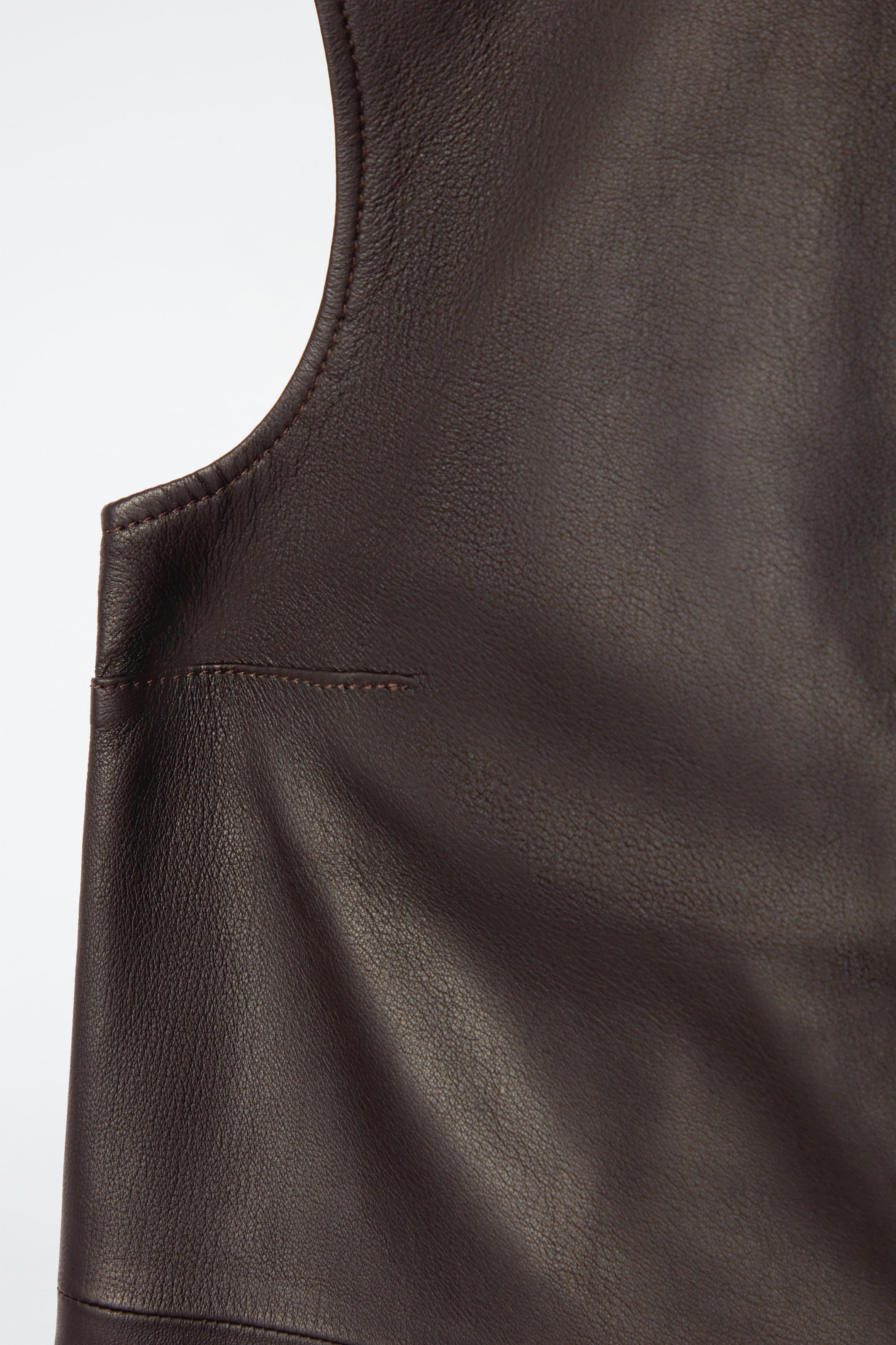 The womenswear designers offer a refined take on the sleeveless top for Autumn Winter 2024. Crafted from supple leather, this panelled piece is tanned a rich espresso tone and stitched with bust darts to define the shape. It features an exposed zip at the back and side slits at the hem.