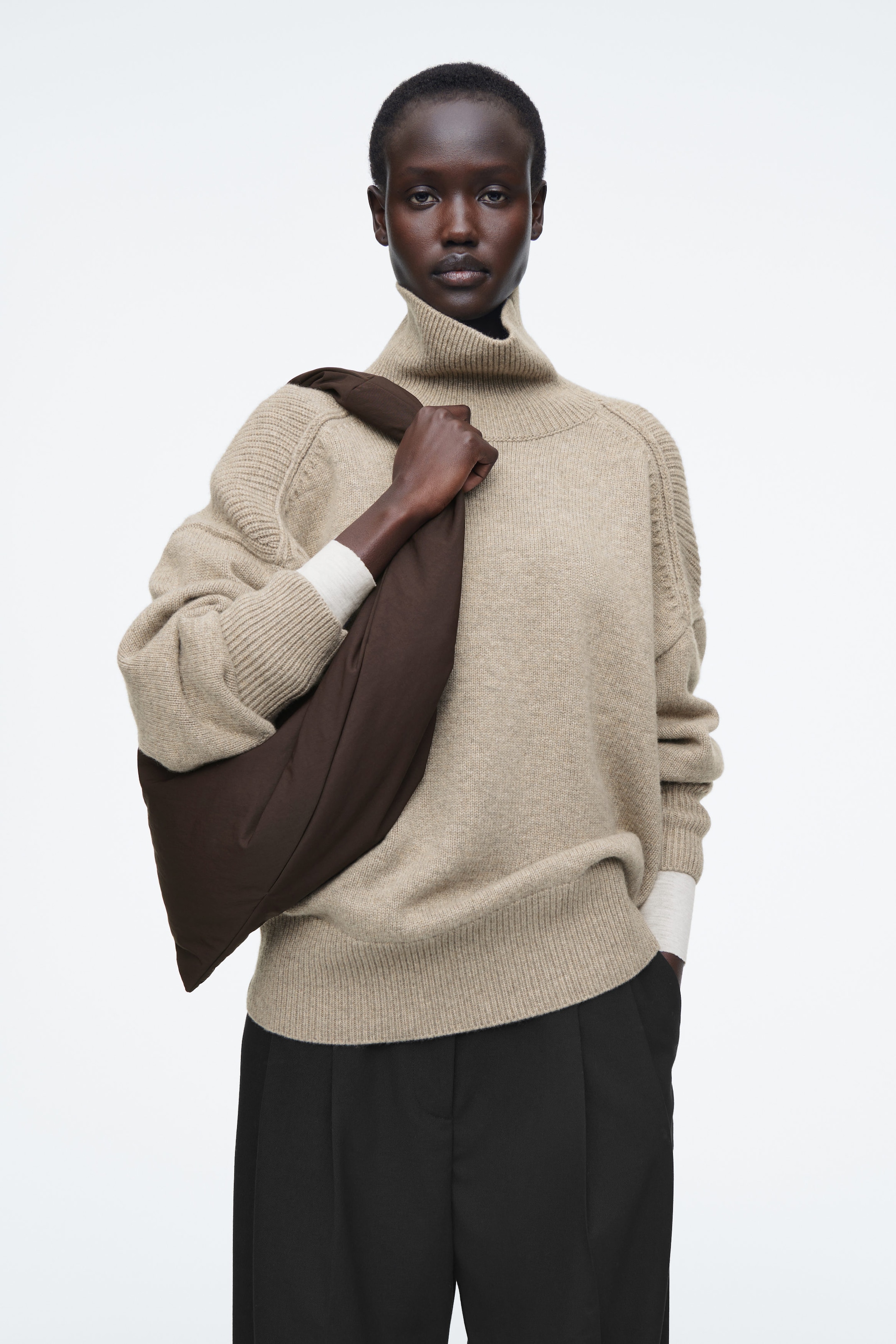 The COS accessories collection spotlights talking-point pieces like the new-season Kite bag. Named for its angular shape, it has a distinctive asymmetric silhouette and a tonal strap that rests on the shoulder. It's made from recycled nylon in our trademark pillowy texture and closes with a secure zip.